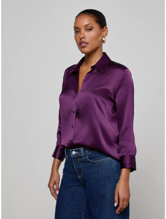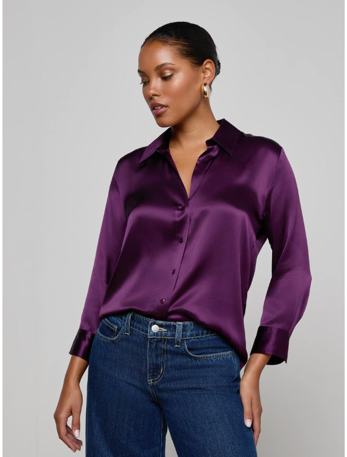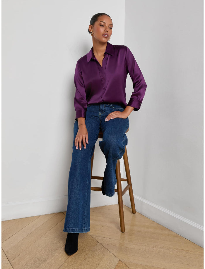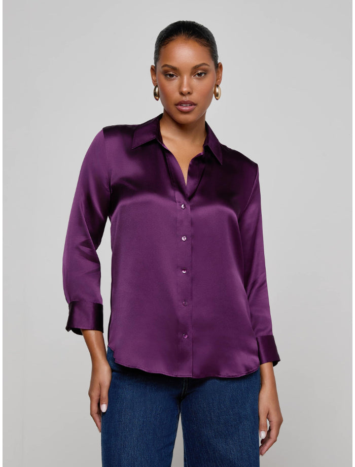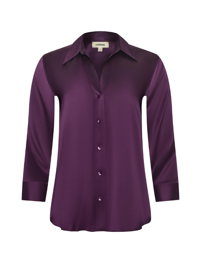 L'Agence classic button down blouse with a luxurious, light catching luster charmeuse silk drapes effortlessly to a shorter, curved hem with three-quarter-length sleeves and a relaxed open collar, slim fit. Size XS - Sleeve Length 19", Length 26".