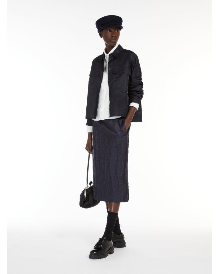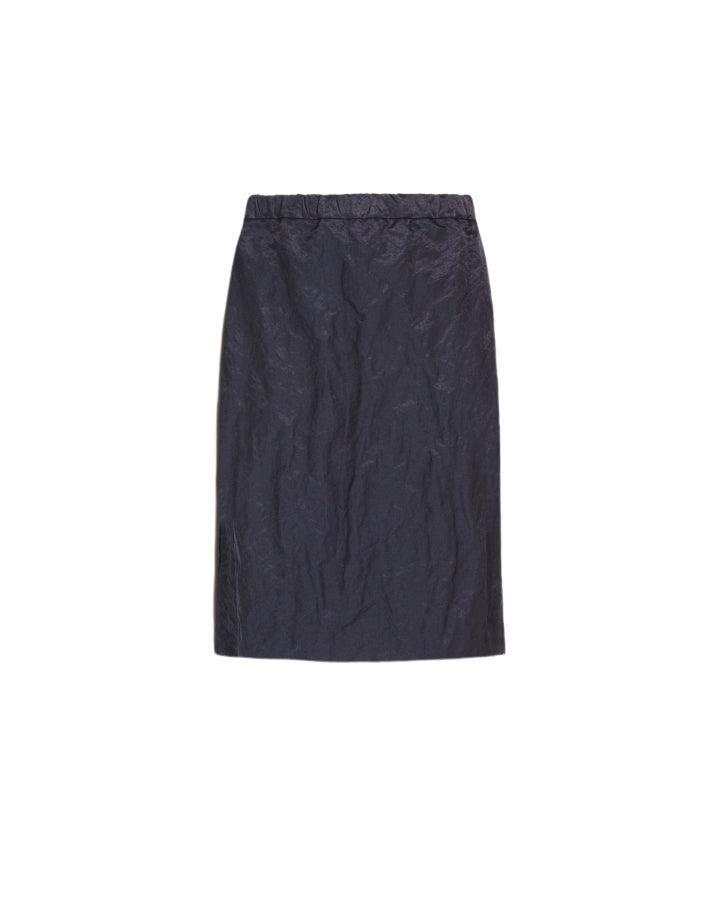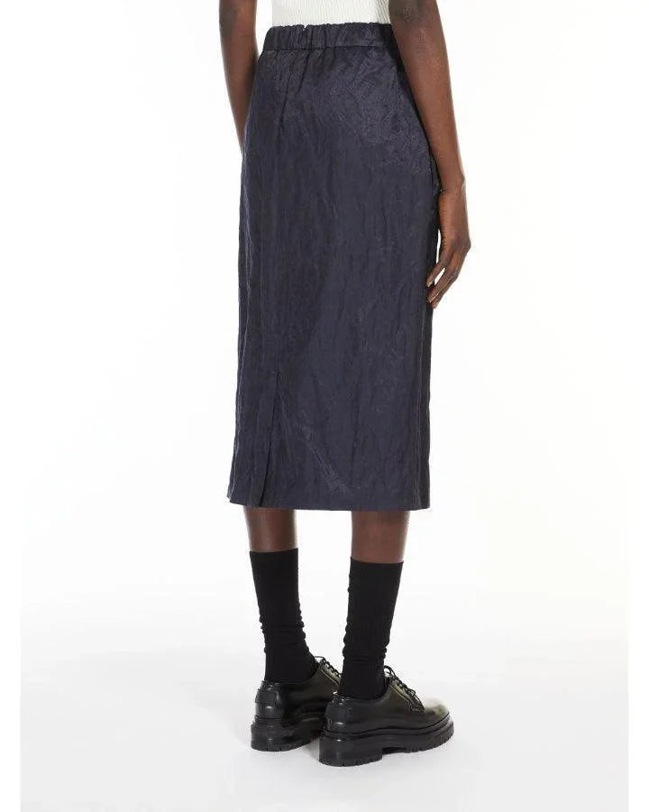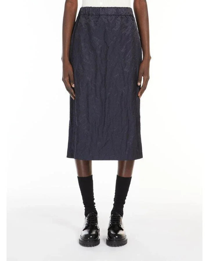 Max Mara Weekend Straight-fit pencil skirt in fine washed satin fabric featuring a modern yet elegant crinkle-look texture. The lined model boasts an elasticated waist, in-seam side pockets and a central rear slit. Concealed zip fastening.