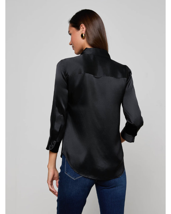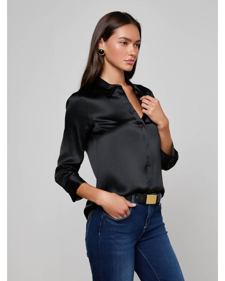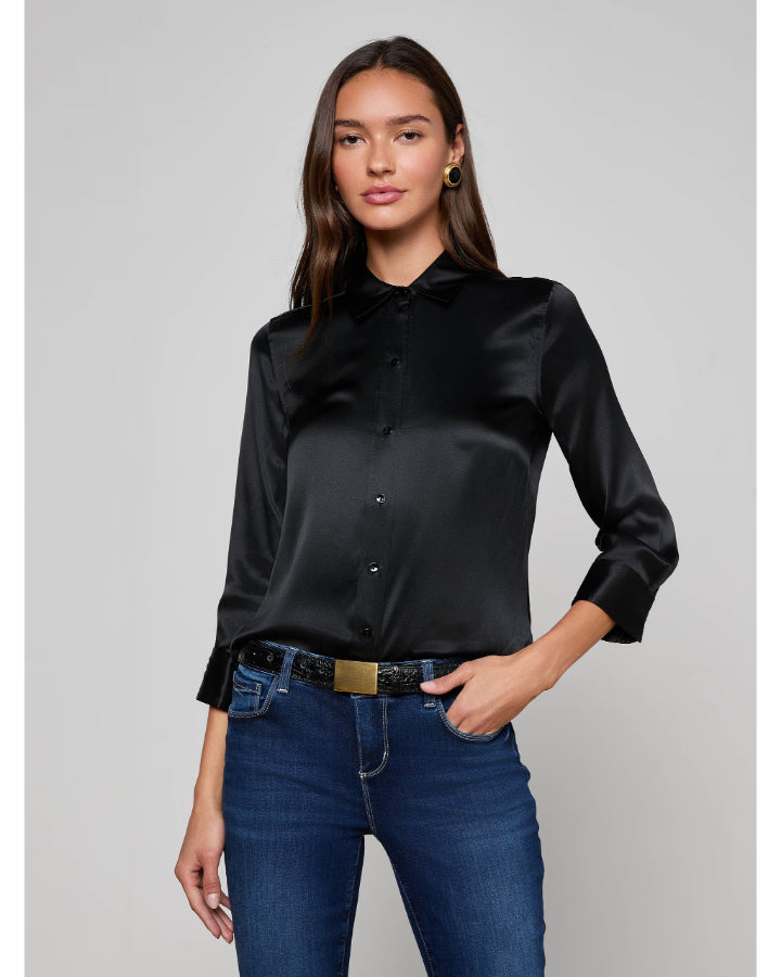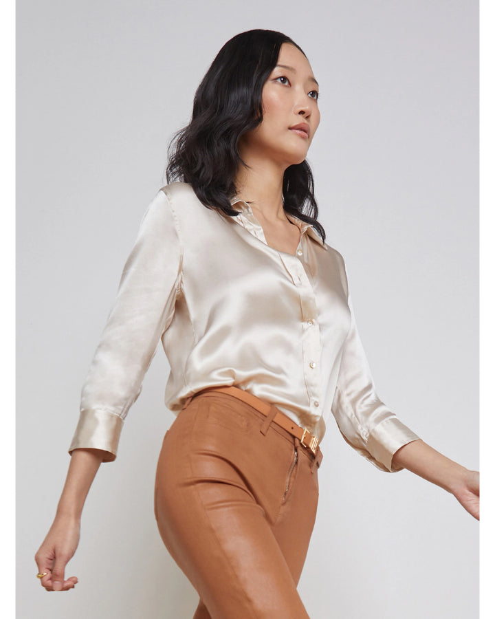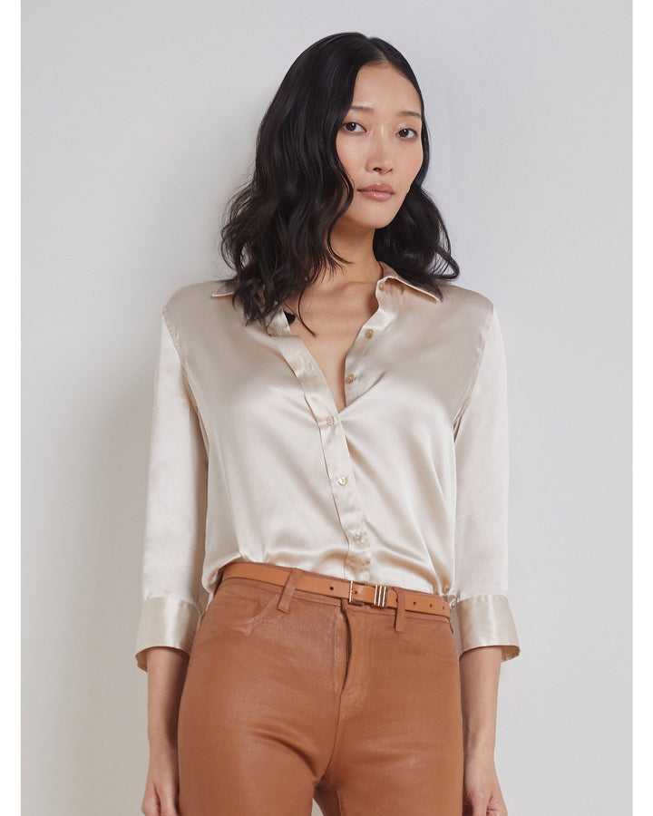 L'Agence classic button down blouse with a luxurious, light catching luster charmeuse silk drapes effortlessly to a shorter, curved hem with three-quarter-length sleeves and a relaxed open collar, slim fit. Size XS - Sleeve Length 19", Length 26".