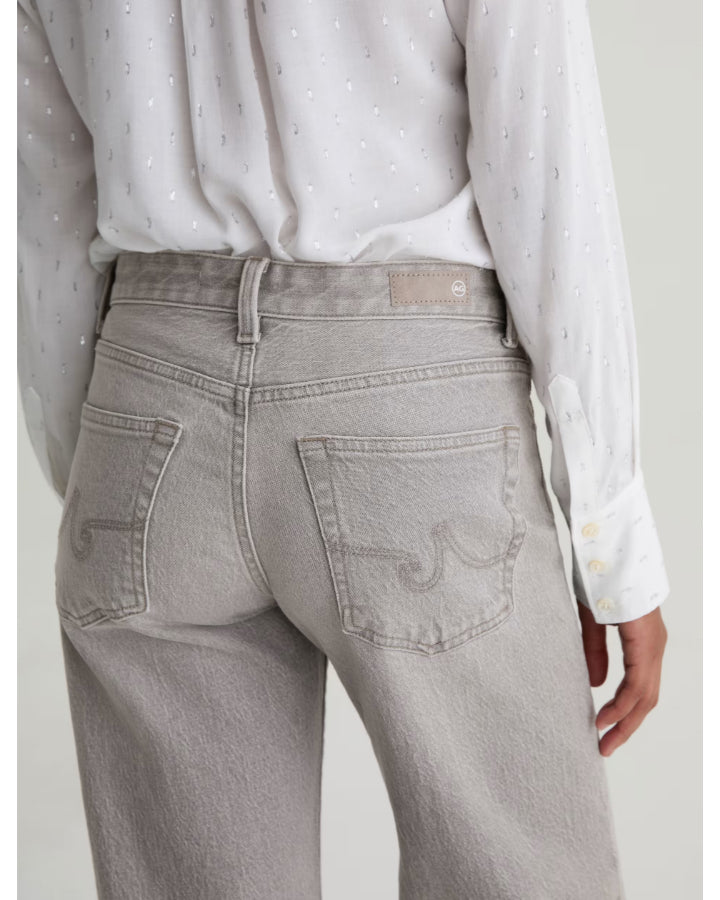 Adriano Goldschmied Jeans in Flex 360 all-direction stretch denim for boundless comfort jeans. Features low-rise waist that hangs on the hip and a loose wide leg that puddles at the hem. Designed in the light stone grey wash, Silver Myst, with shimmery ombré foiled detailing that smoothly transitions from hem to knee. Classic five pocket styling with button and zip closure. Size 26 - Rise 9.5". Inseam 32", Knee Opening 22", Bottom Opening 21".