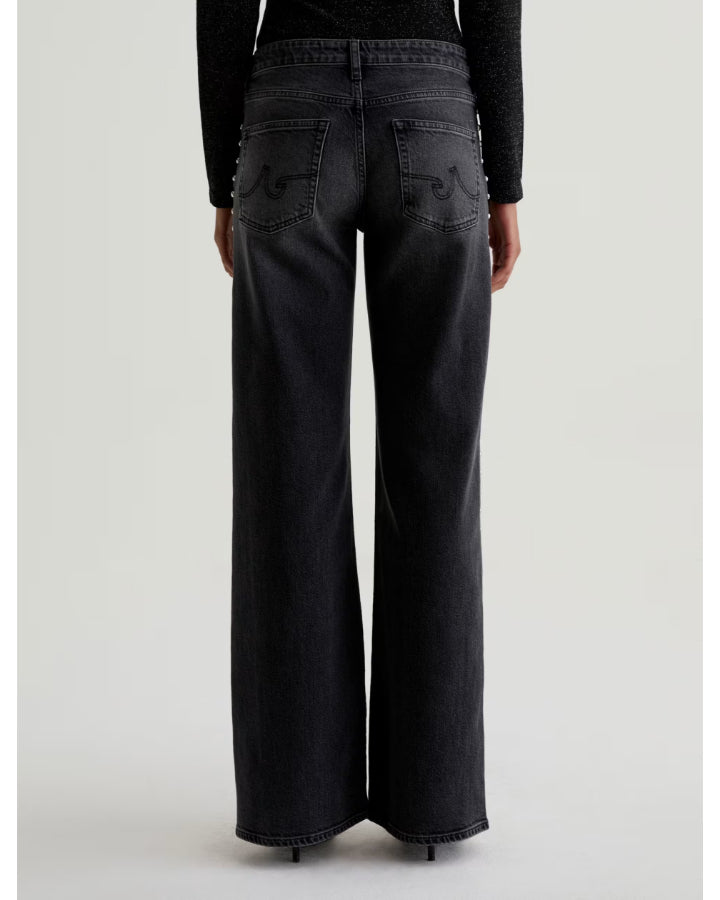 Adriano Goldschmied Jeans comfort stretch black wash denim jeans have a low rise waist that hangs on the hip and a loose wide leg that puddles at the hem. Embellished with round metal studs along the side seam for a contemporary edge. Designed with highs and lows, whiskering, and light fading. Classic five pocket styling with button and zip closure. Size 26 - Rise 9.5", Inseam 32", Knee Opening 22", Bottom Opening 21".