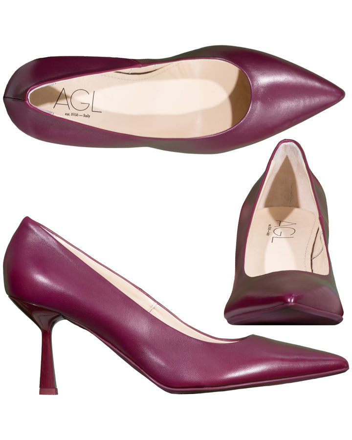 AGL classic leather pump paired with a leather insole with memory foam that is comfortable and breathable, ensures comfort and long-lasting quality. Lacquered 7 cm heel.