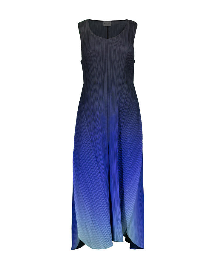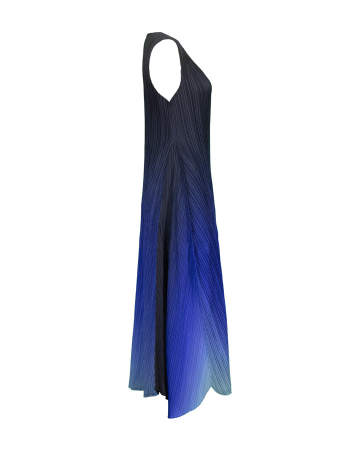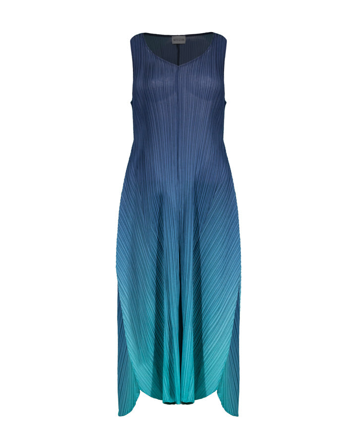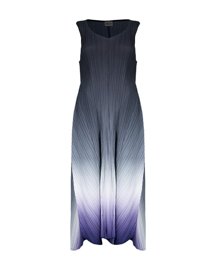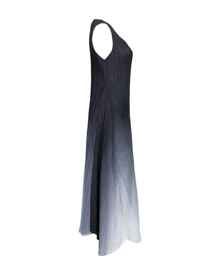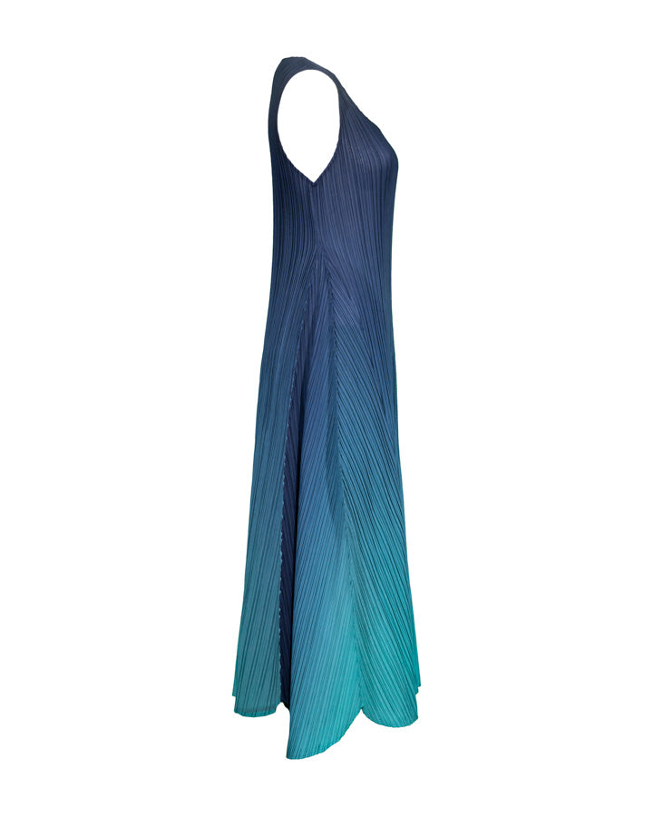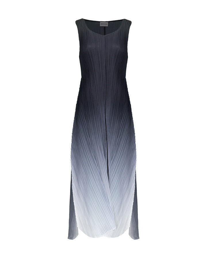 Alquema formal and fun plisse fabric long sleeveless dress with rounded V-neck is relaxed yet figure hugging. Dress entwines an ombre of color with form and structure. Length - 49.6"
