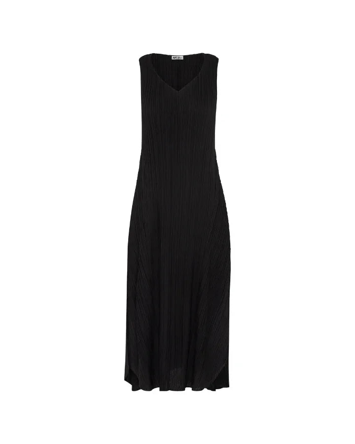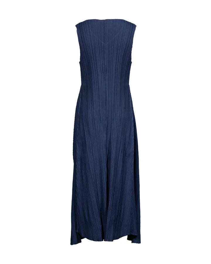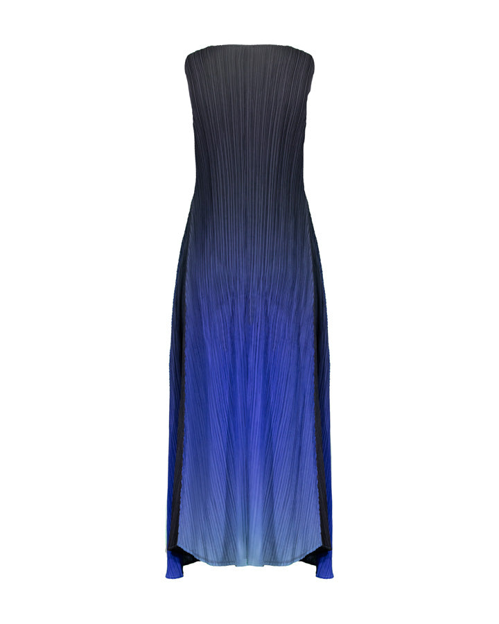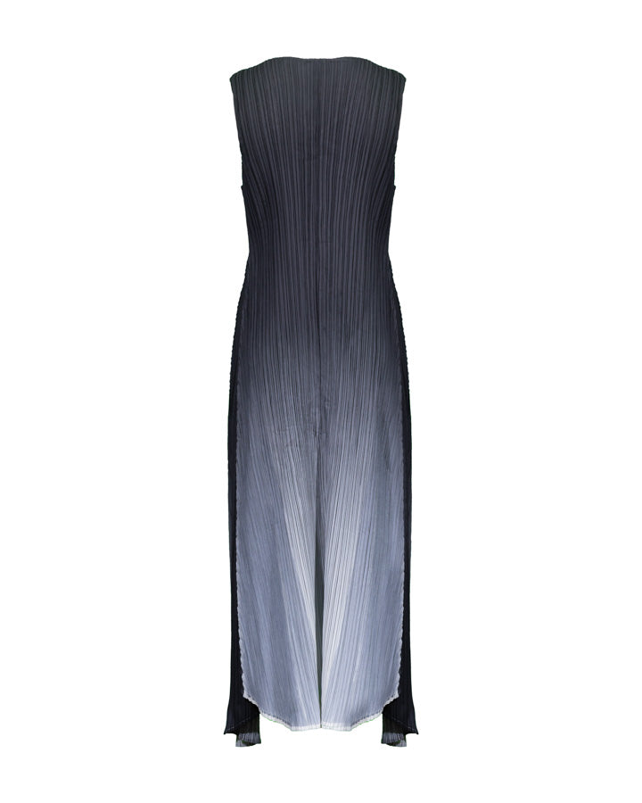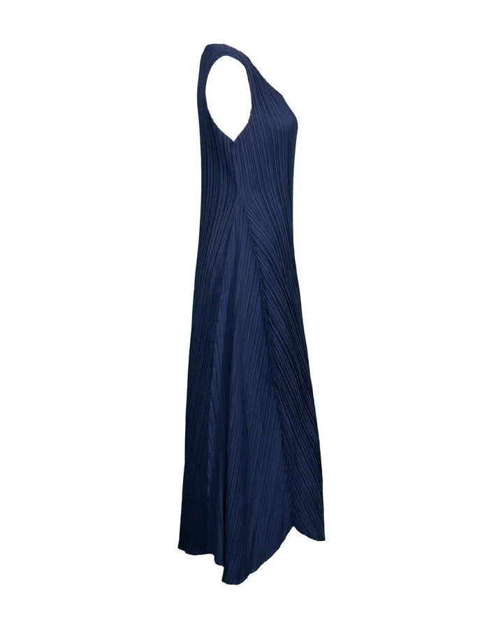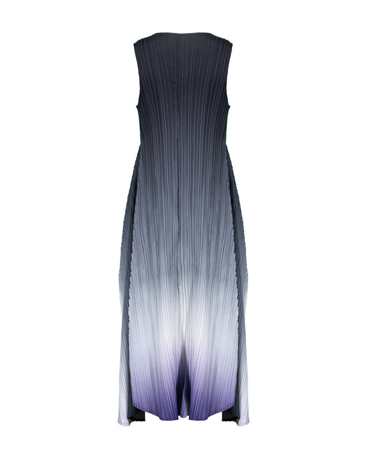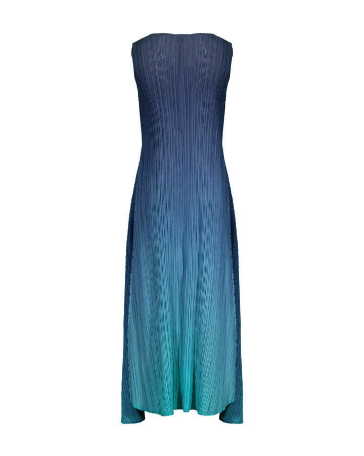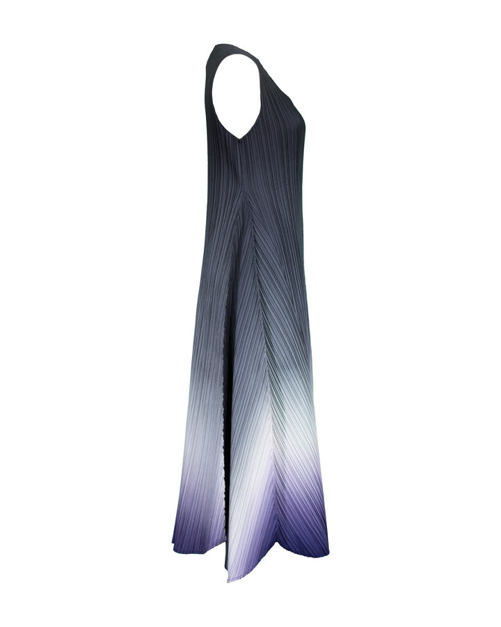 Alquema formal and fun plisse fabric long sleeveless dress with rounded V-neck is relaxed yet figure hugging. Dress entwines an ombre of color with form and structure. Length - 49.6"