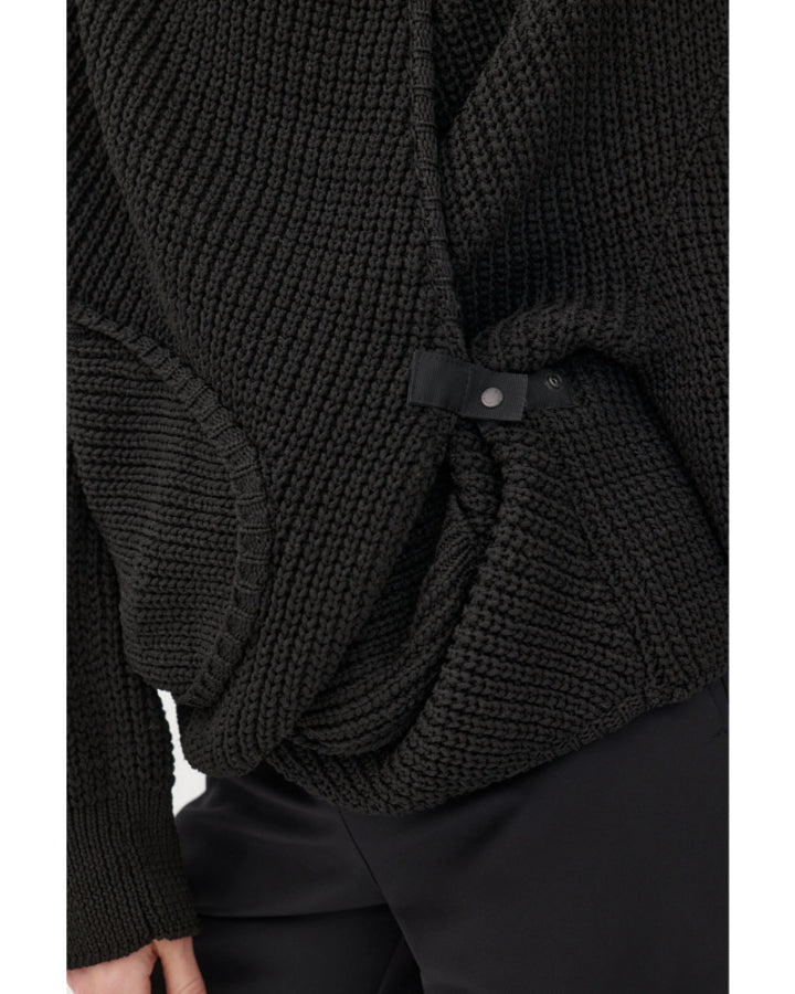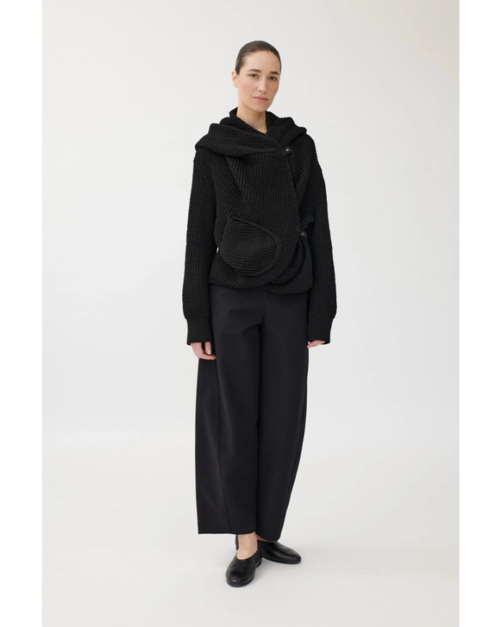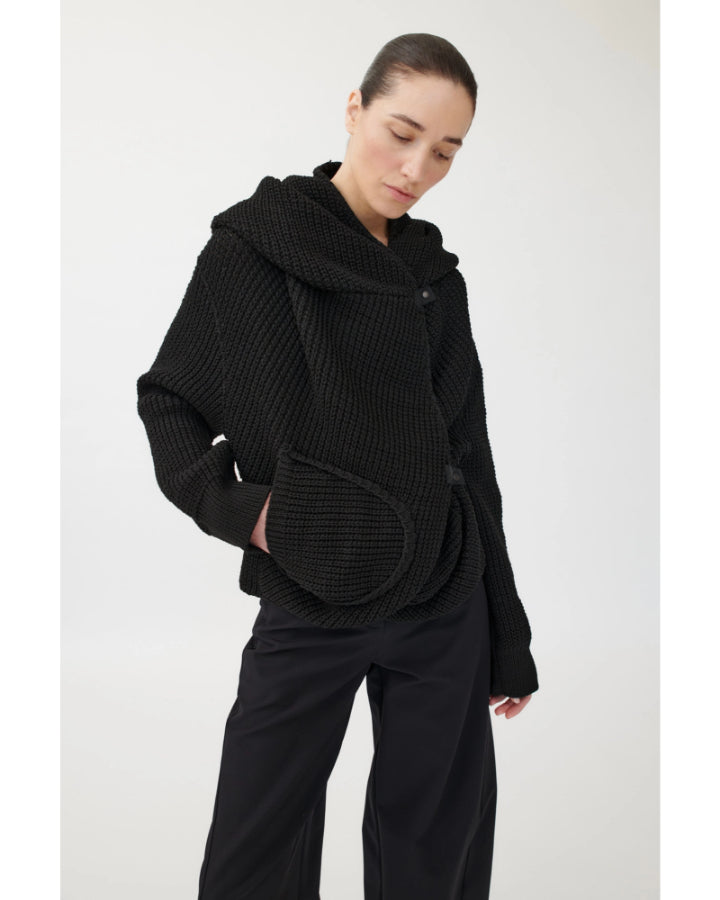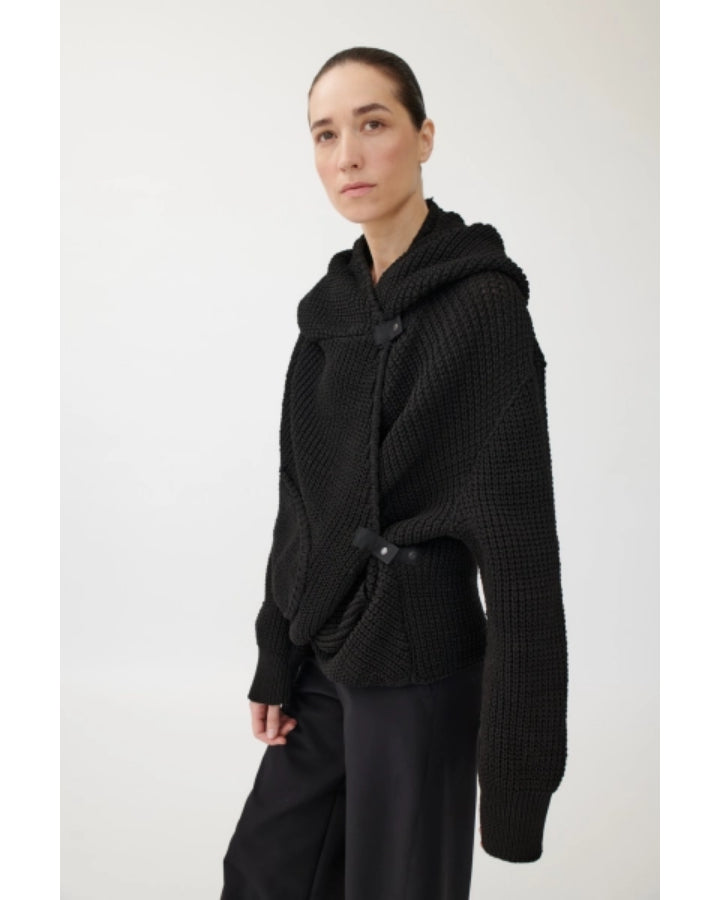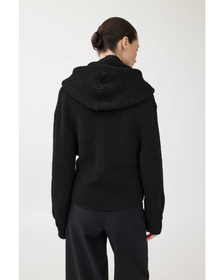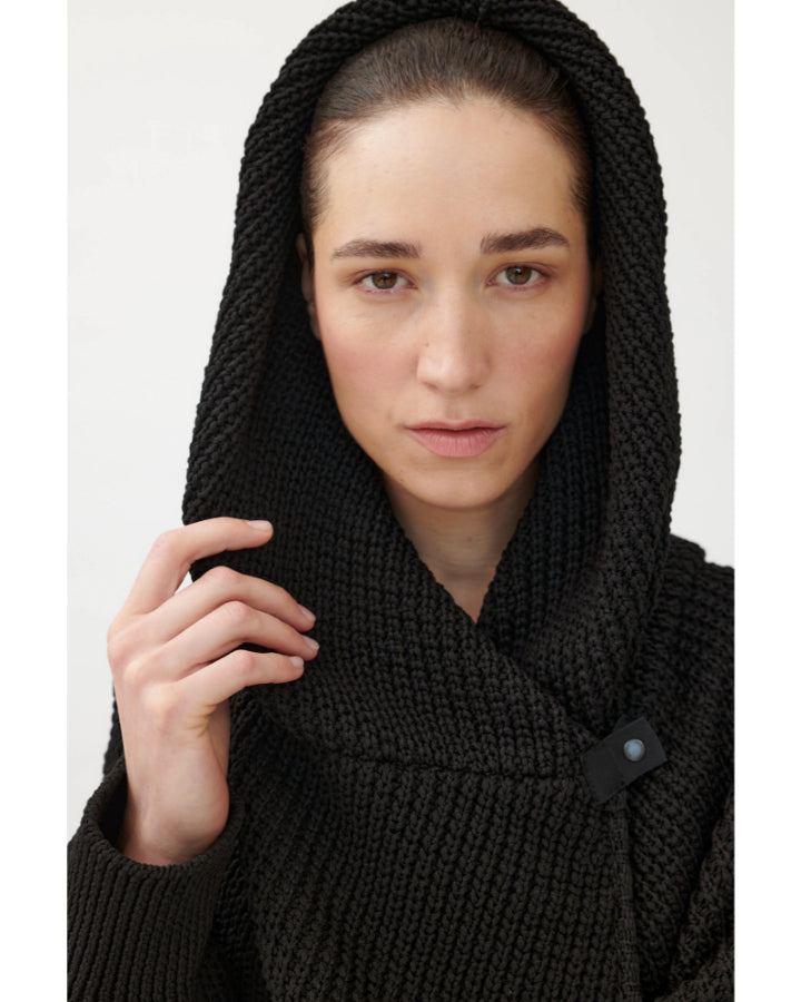 Annette Gortz sporty slim silhouette textured seed stitch knit cardigan with an oversized hood, patch pockets, generous front panels can be overlapped and fastened with snap button for versatile styling.