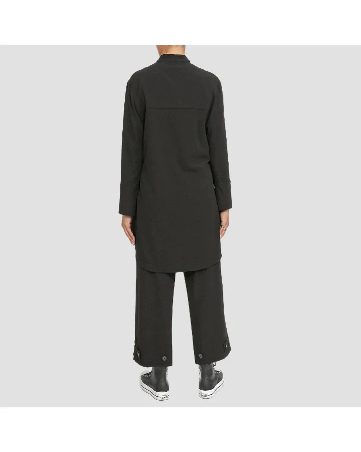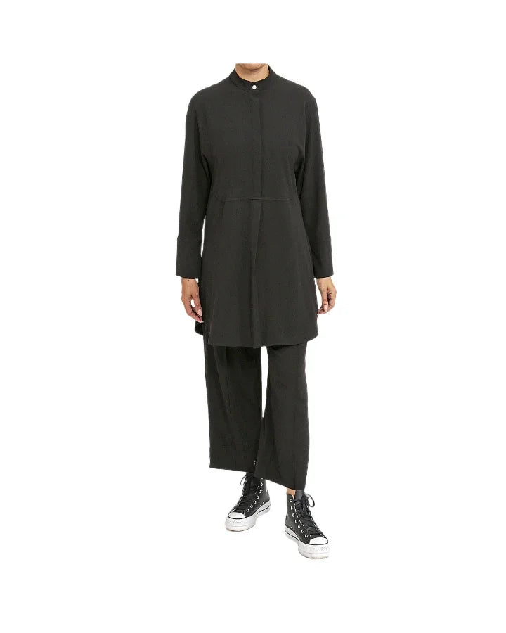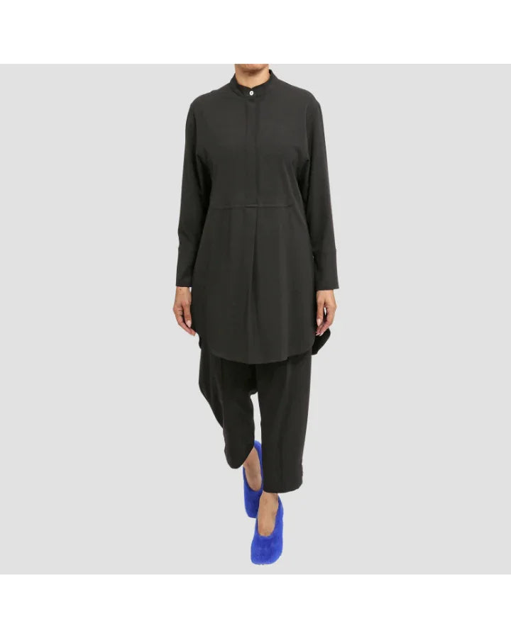 Ayrtight easy fit stretchy jersey long blouse with pearl buttons under a covered placket, flattering bib front and rounded hem.