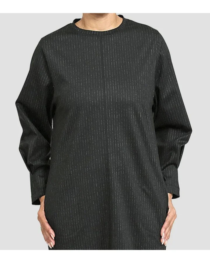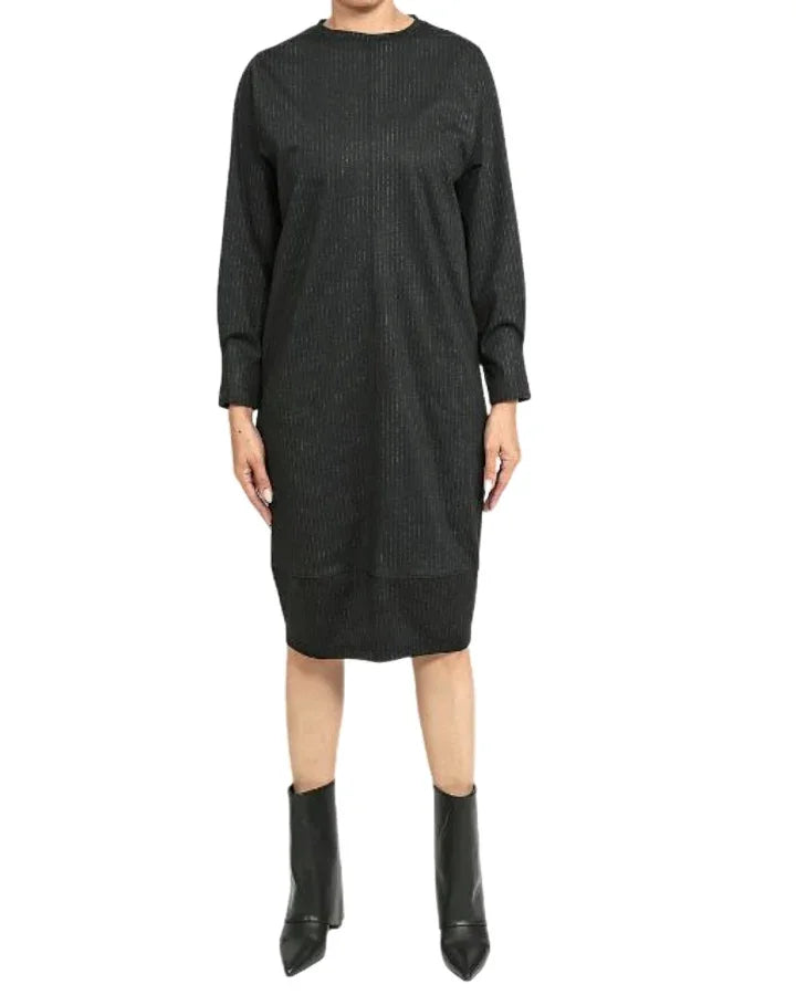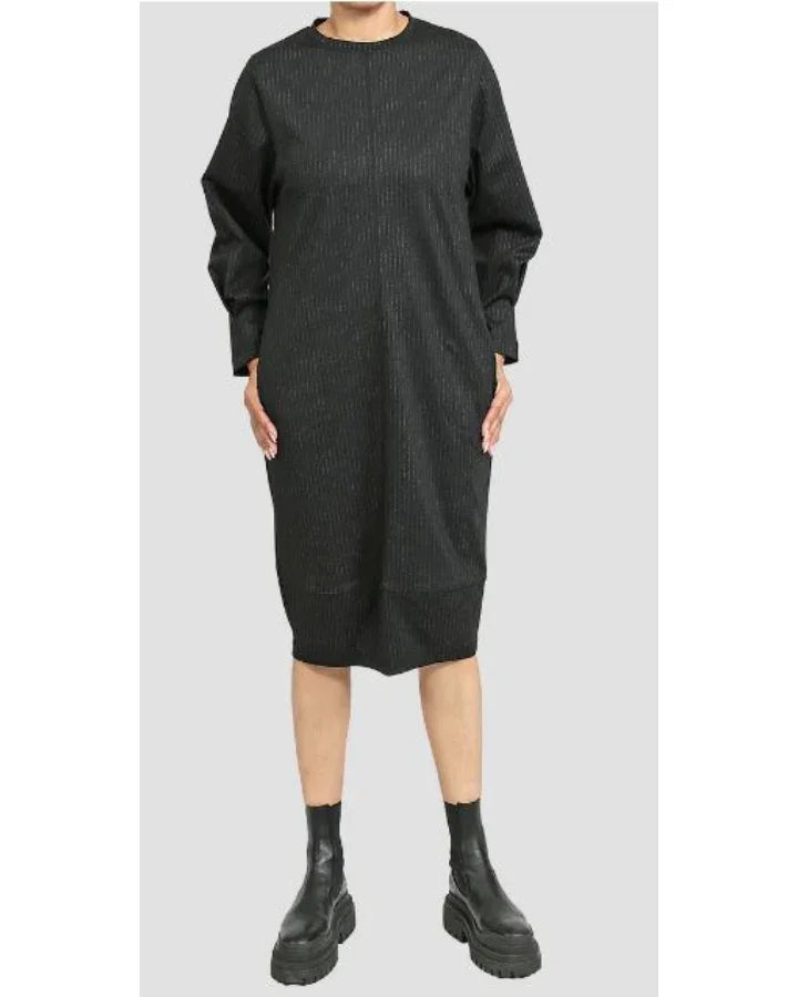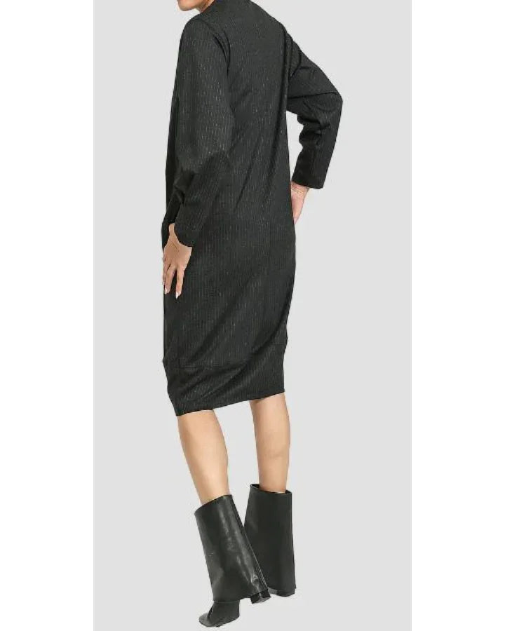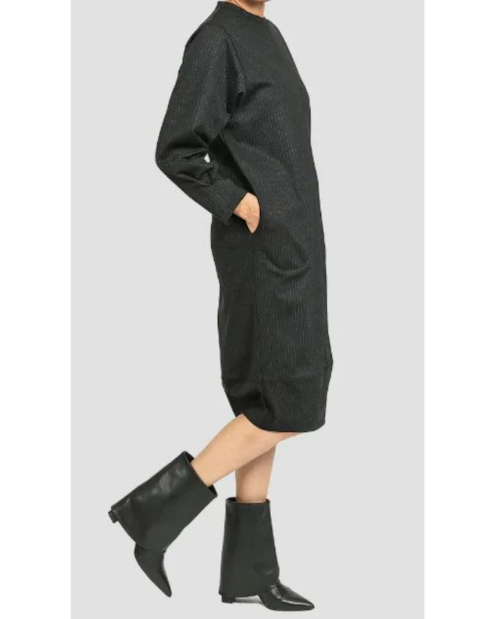Ayrtight pinstripe ponte banded crew neck on slim cocoon shape dress with curved pockets, pleated cuff detail and double topstitch throughout.