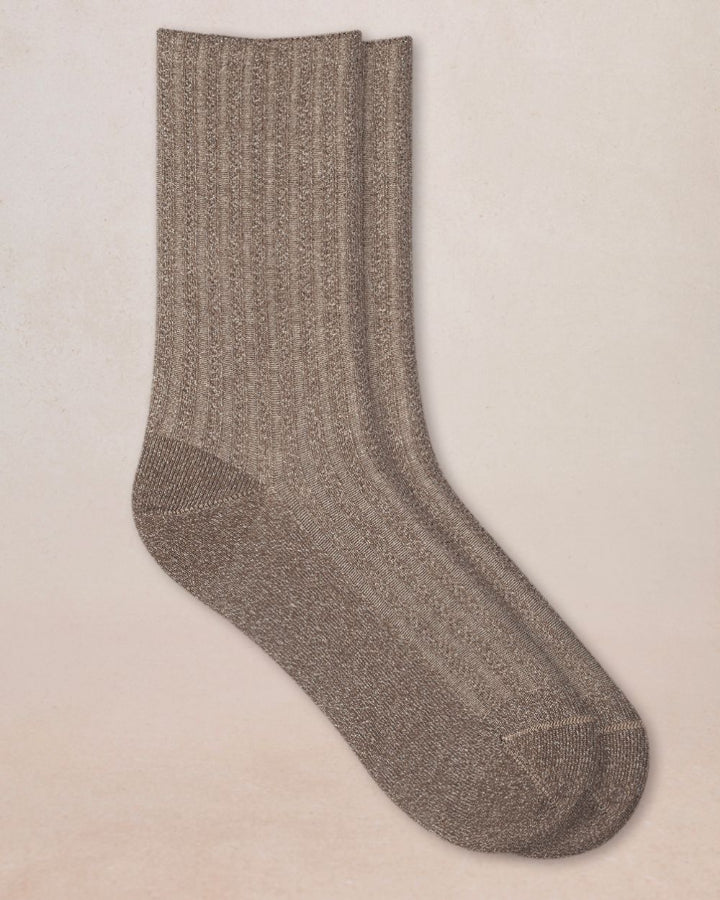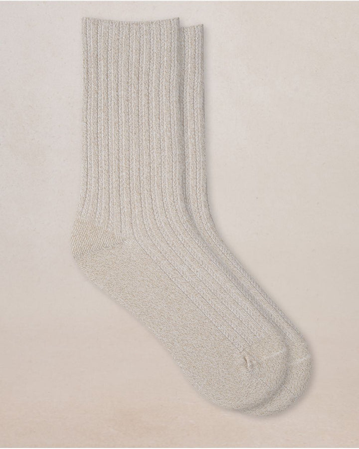Bleu Foret combed cotton blended with a shiny lurex yarn ribbed socks with reinforced heels and toes, non-compressive cuffs for all day comfort.