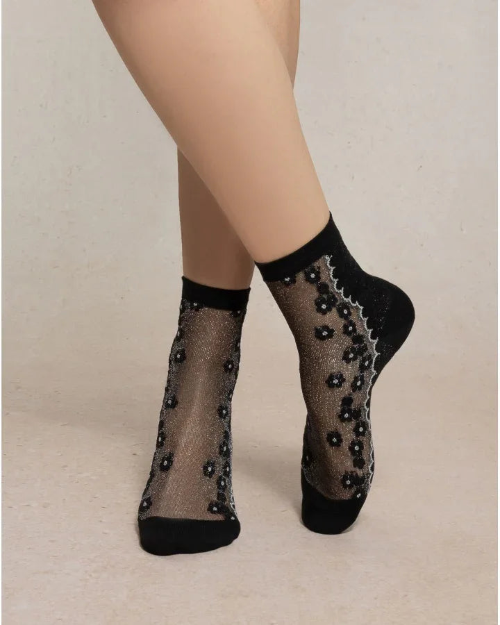 Bleu Foret low-cut sheer socks are dotted with small embroidered flowers that add a romantic and joyful touch to your look. Features transparent and iridescent, cotton insoles, soft ribbing, flat pointed seams and reinforced heels and toes.