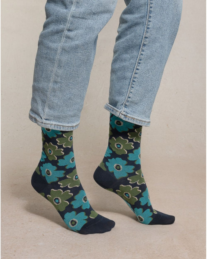 Bleu Foret pure soft cotton socks with a charming petunia pattern, non-compressing rolled-up cuffs, flat pointed seams, reinforced heels and toes. 100% cotton feel against the skin.