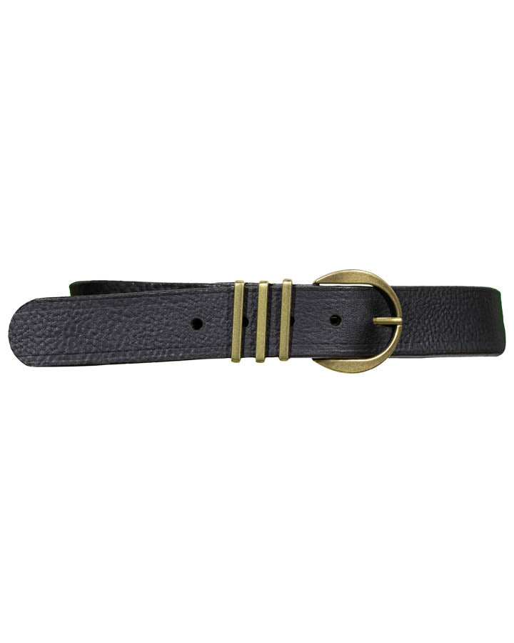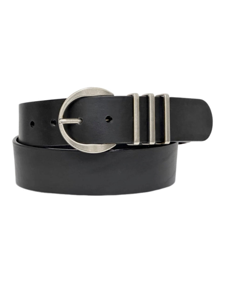 Brave soft raw washed leather belt with a modern geometric C-shaped matte brushed buckle and triple metal keepers, 40mm strap width.