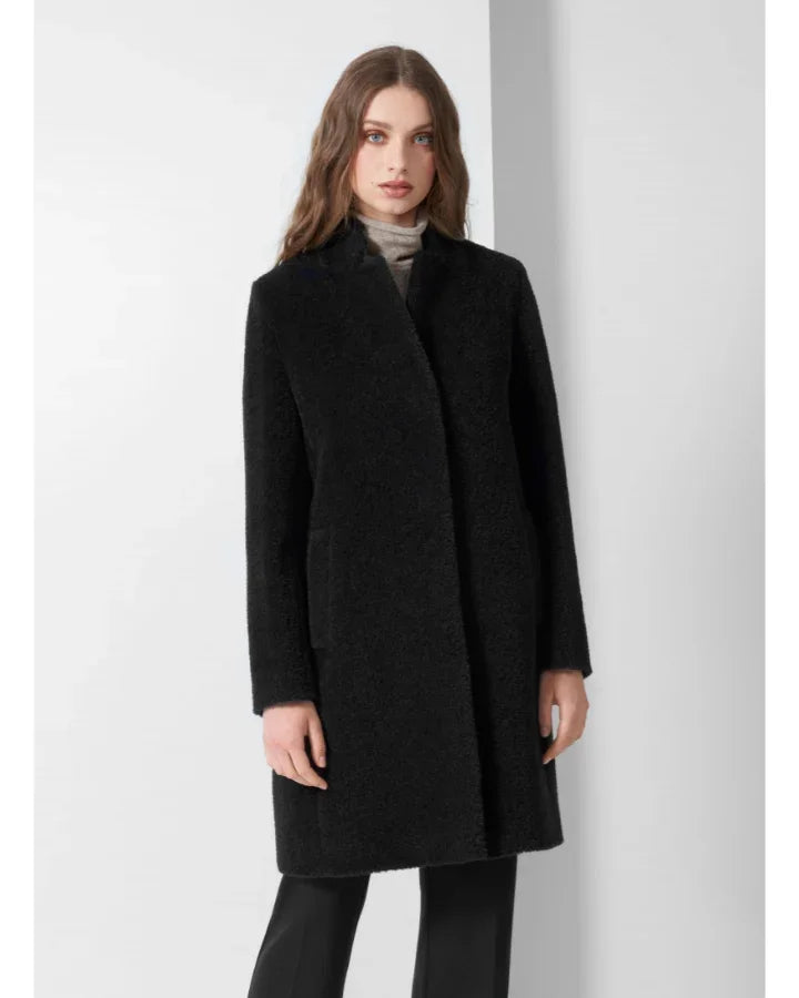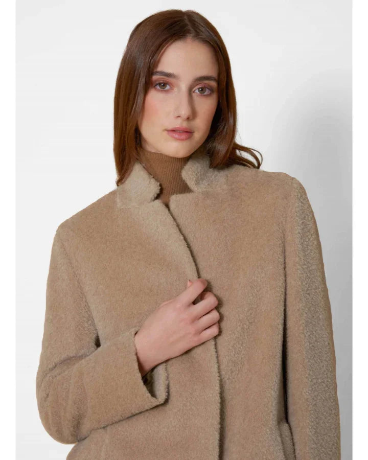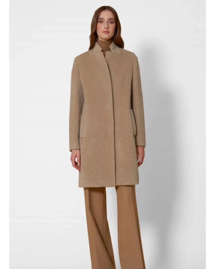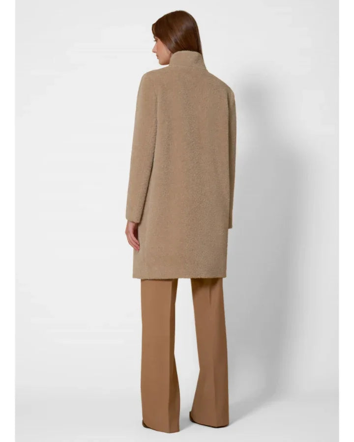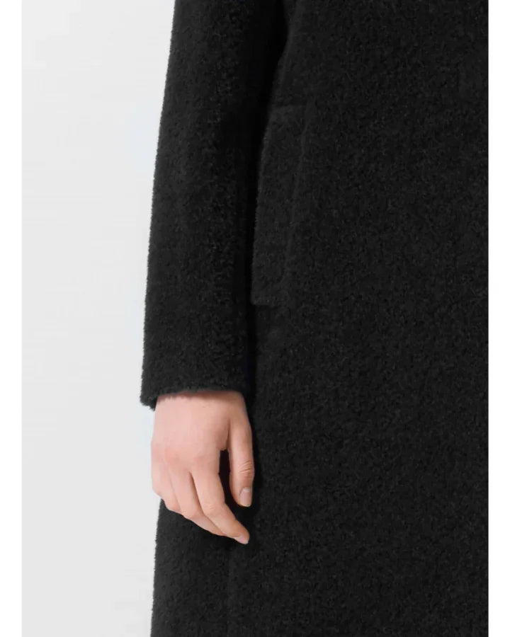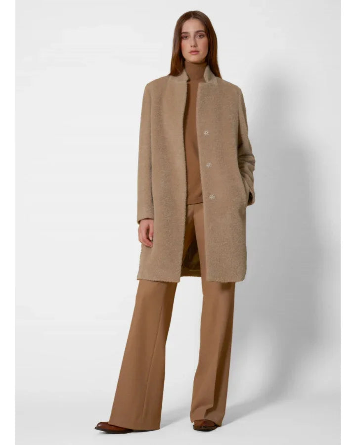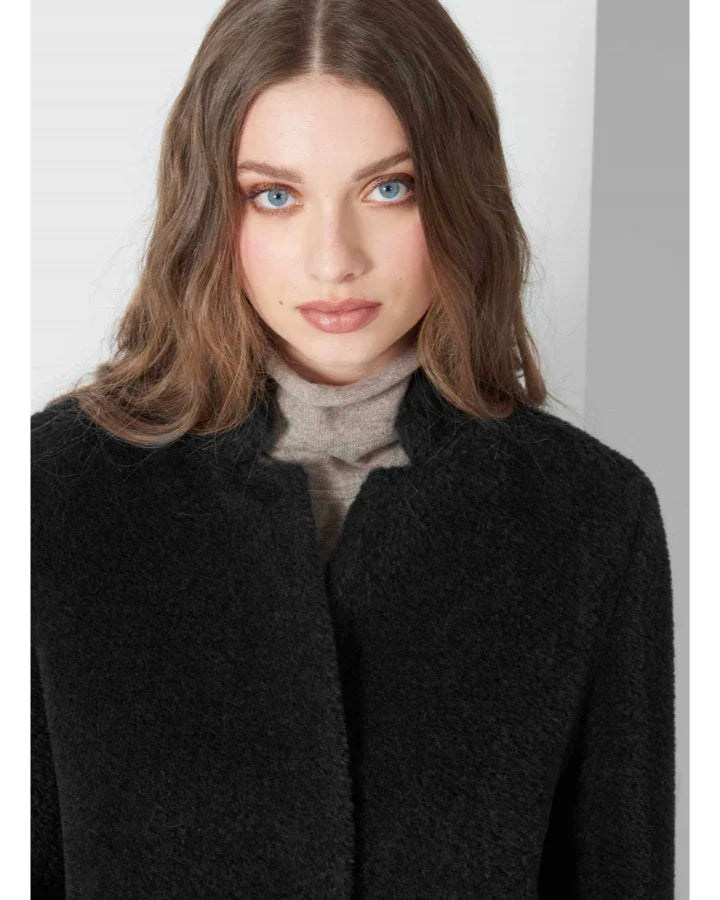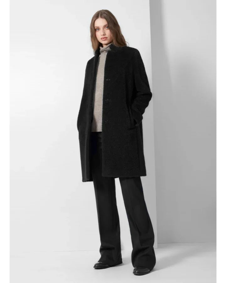 Cinzia Rocca comfortable straight cut wool alpaca blend coat features inverted notch collar, 3 hidden snap button closure, set-in sleeves and welt pockets, Length 90cm.