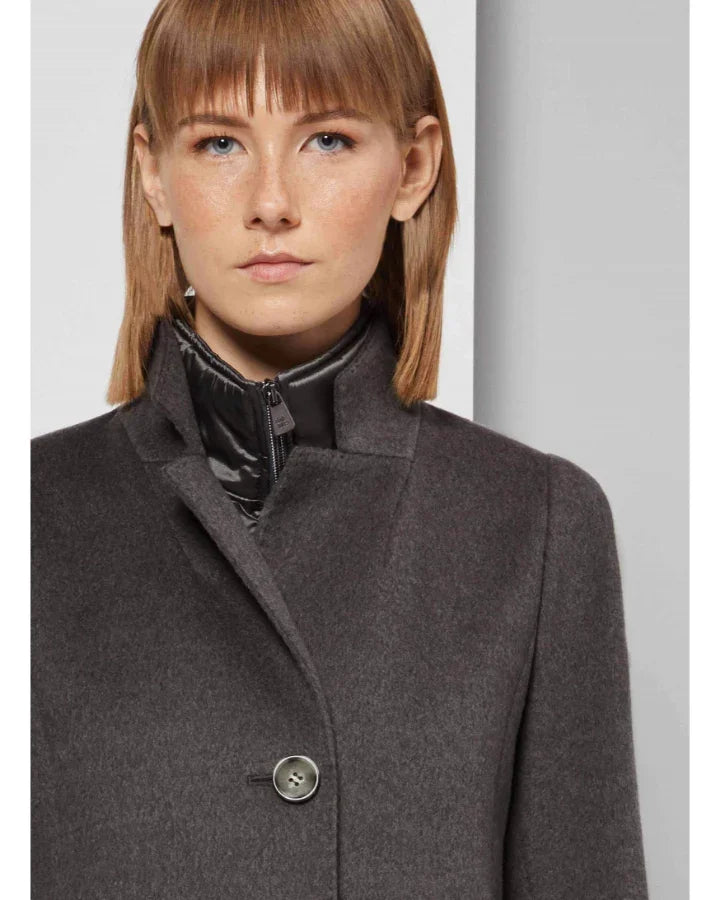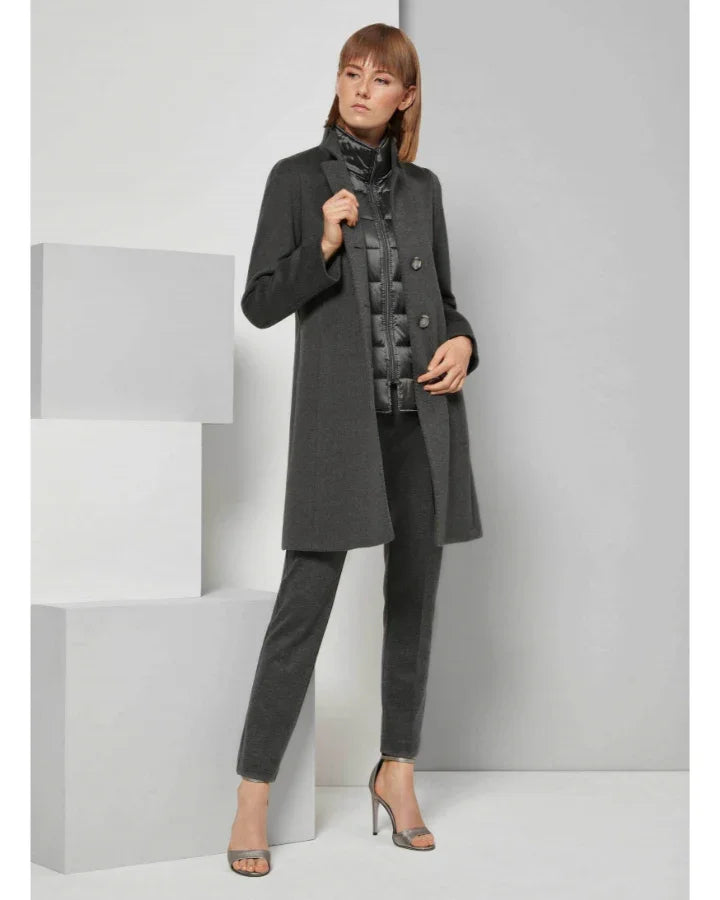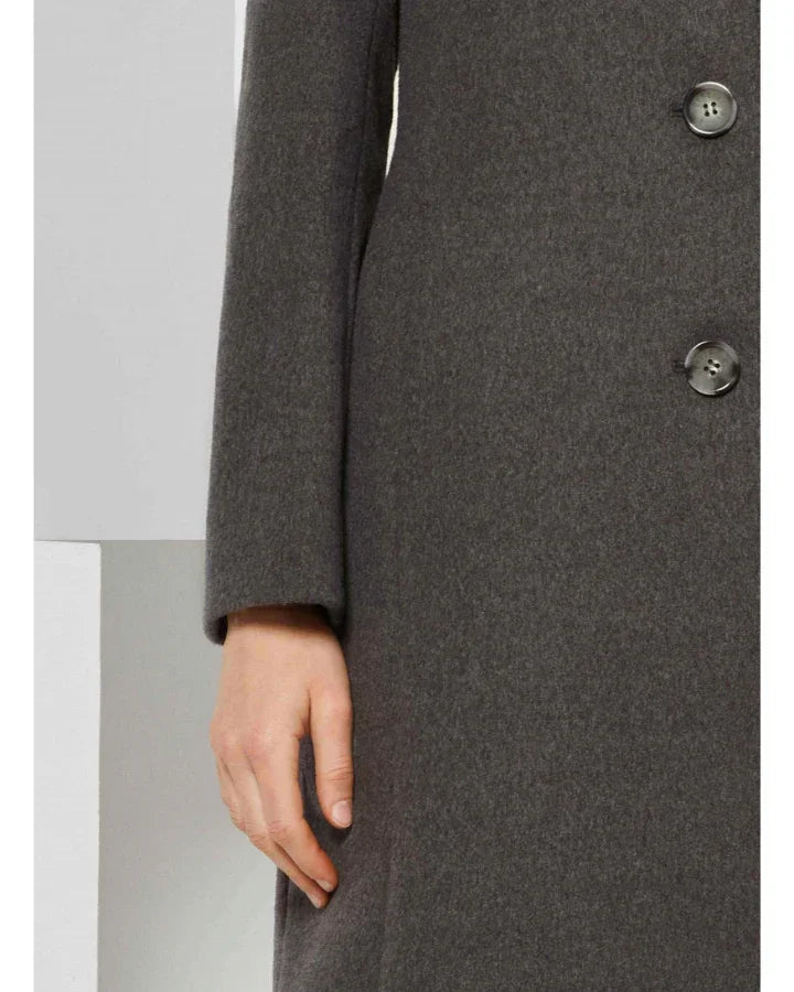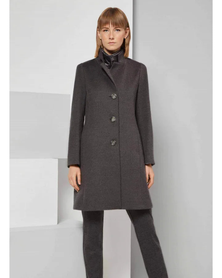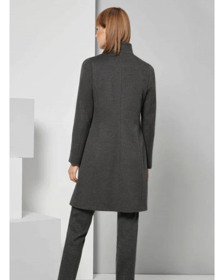 Cinzia Rocca slim fit knee lenght wool coat with inverted notch collar, set-in sleeves, on-seam pockets, detachable padded dickie, 3-button clousure and coat is fully lined. Length 95cm.