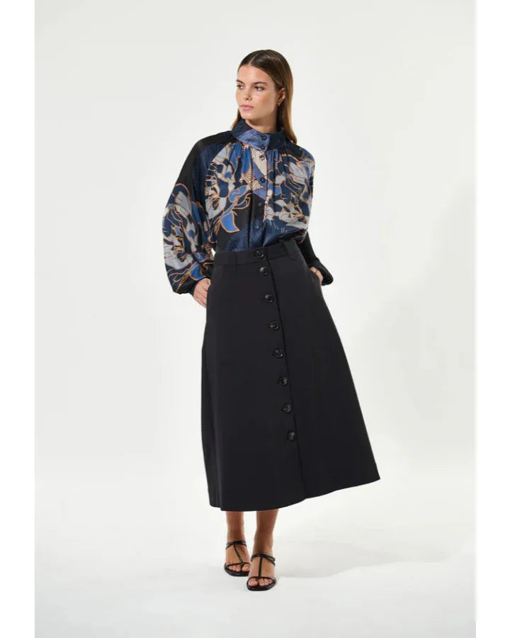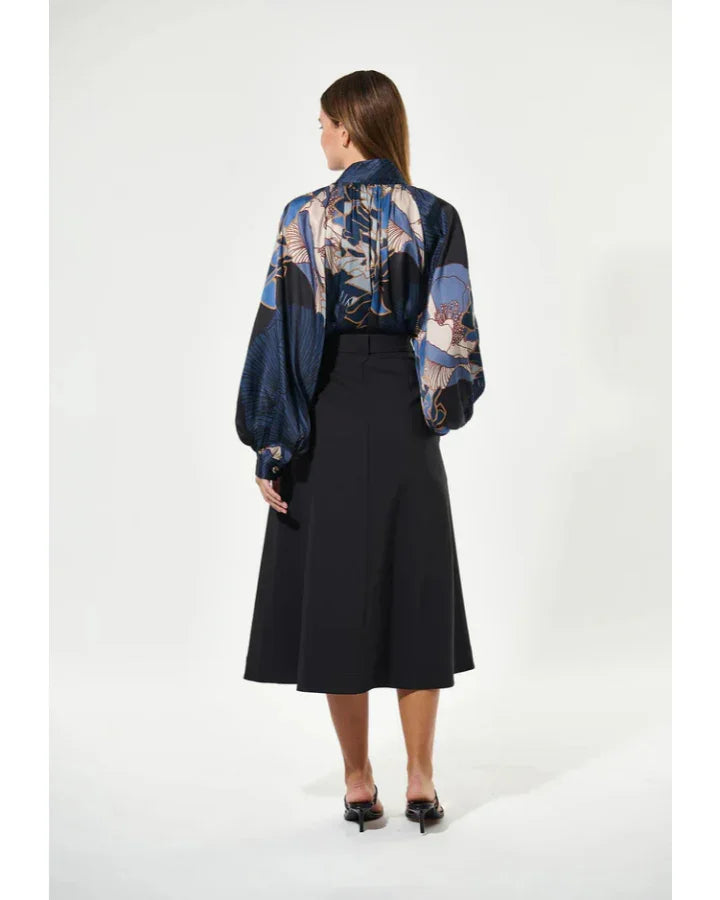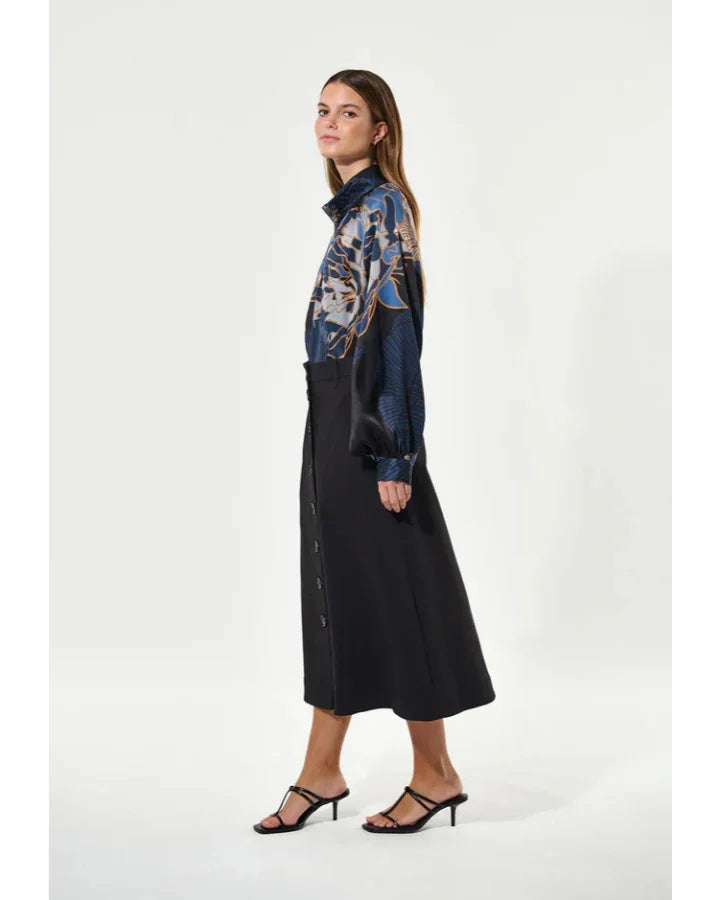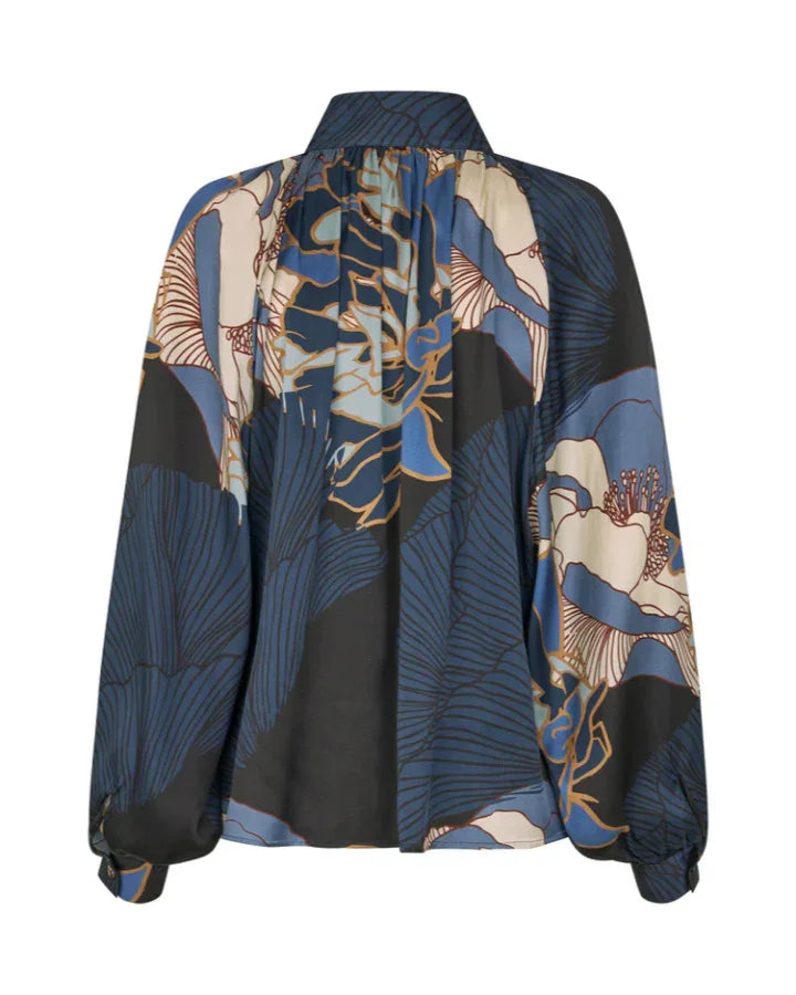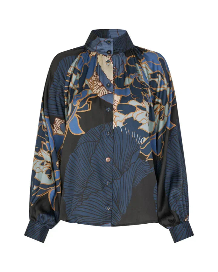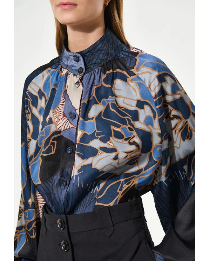 Dea Kudibal loose fit, oversized graphic floral design stretch silk blouse is gathered into a high neck with a button down front, voluminous raglan sleeves with button cuffs.