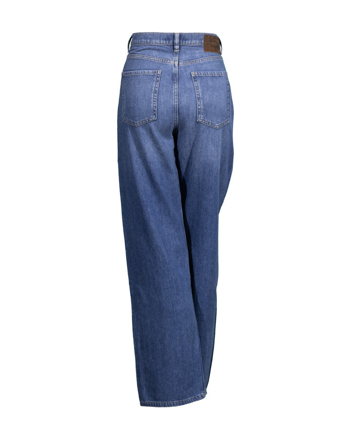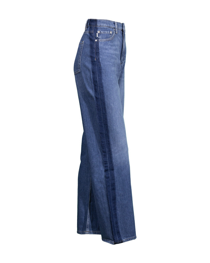 DL1961 high rise, wide leg jeans with contrast stripe down sides of legs, classic five pocket styling, button and zip closure. Inseam 31", Rise 11.75", Leg Opening 18".