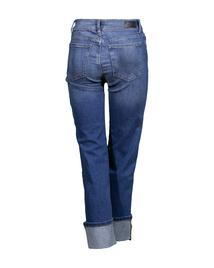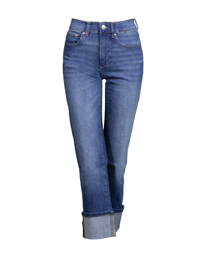 DL1961 straight leg, mid rise jeans with classic five pocket styling, cuffed ankles, button and zip closure. Inseam 27", Rise 9", Leg Opening 13.5".