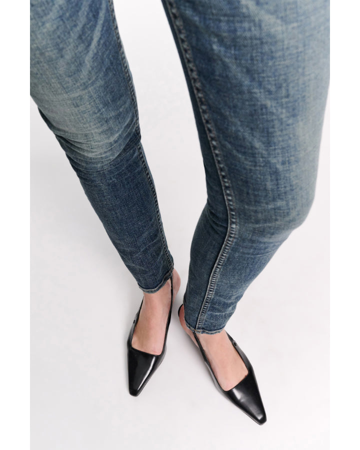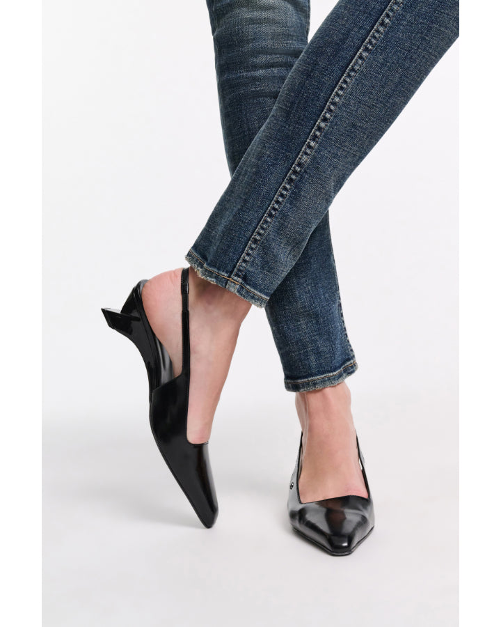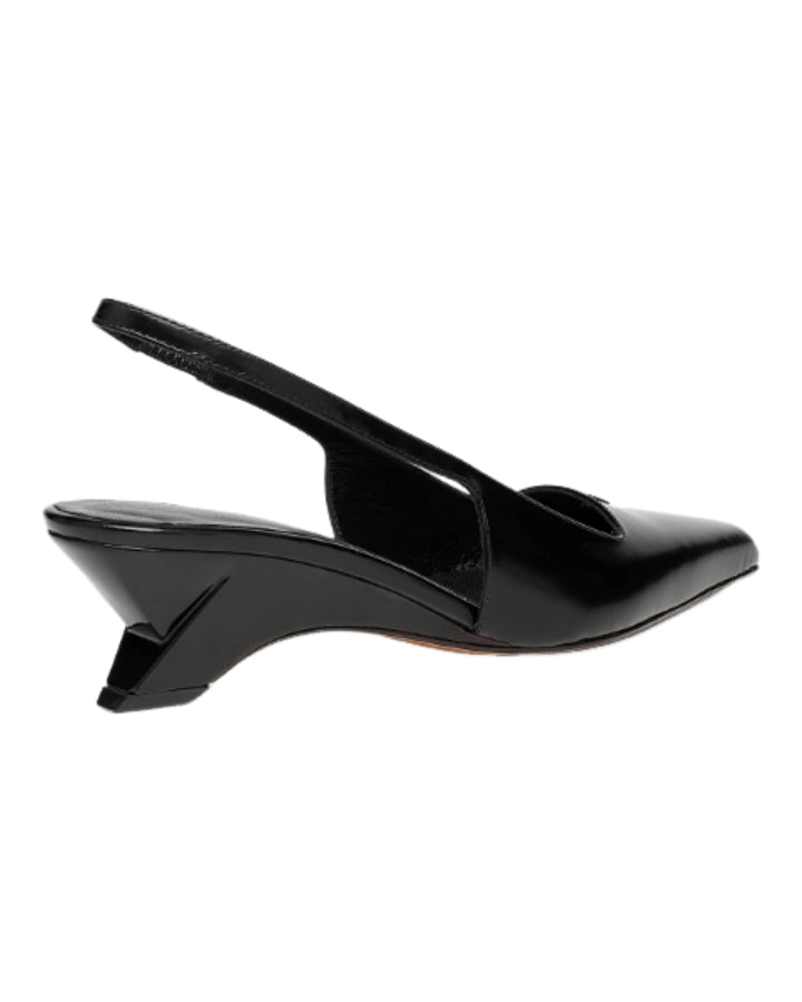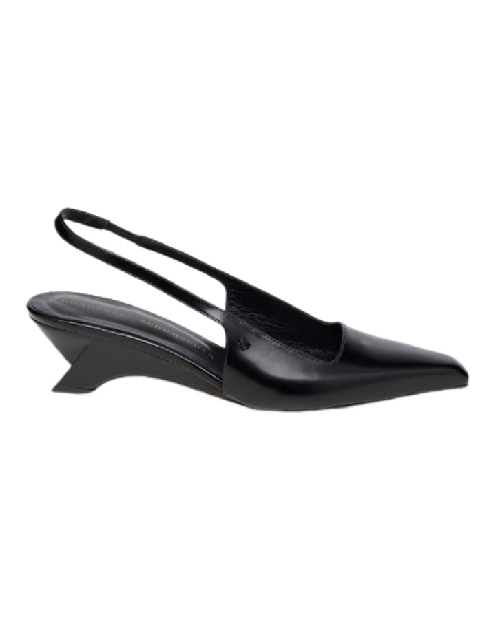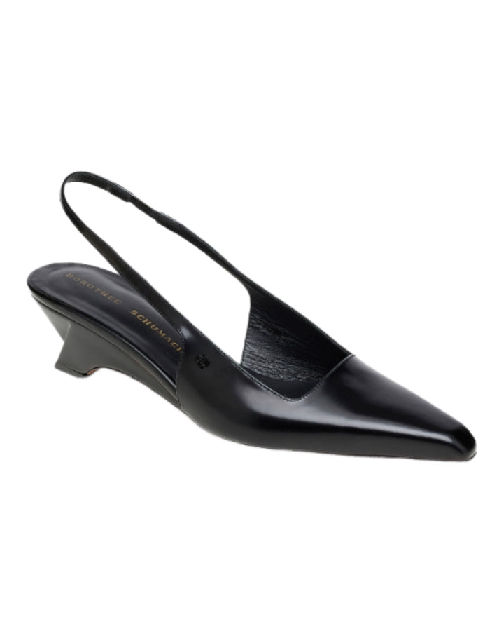 Dorothee Schumacher semi-shine calfskin slingbacks have a pointed toe, which comes to a soft chisel at the tip. The slingbacks feature graphic contour wedges and have an elastic back strap & signature D-Rose rivet embellishment.