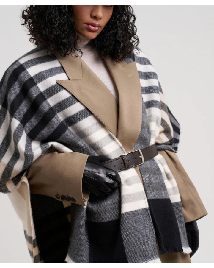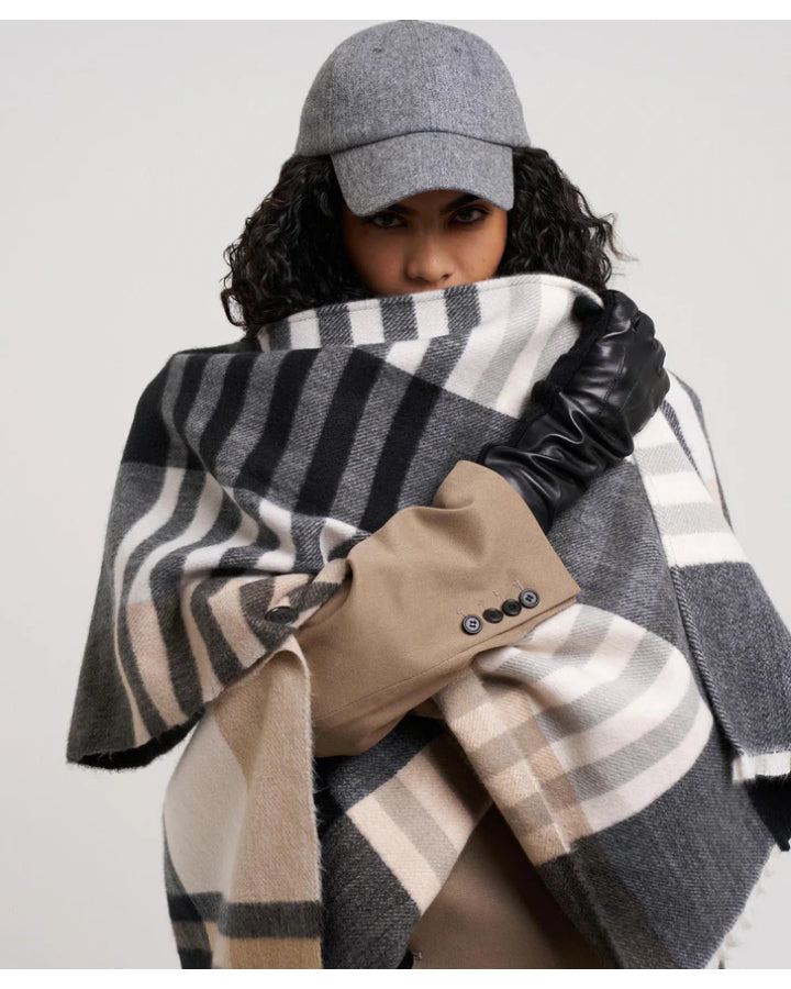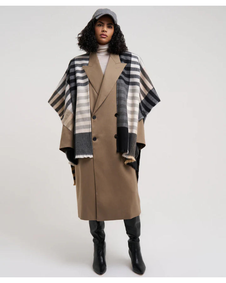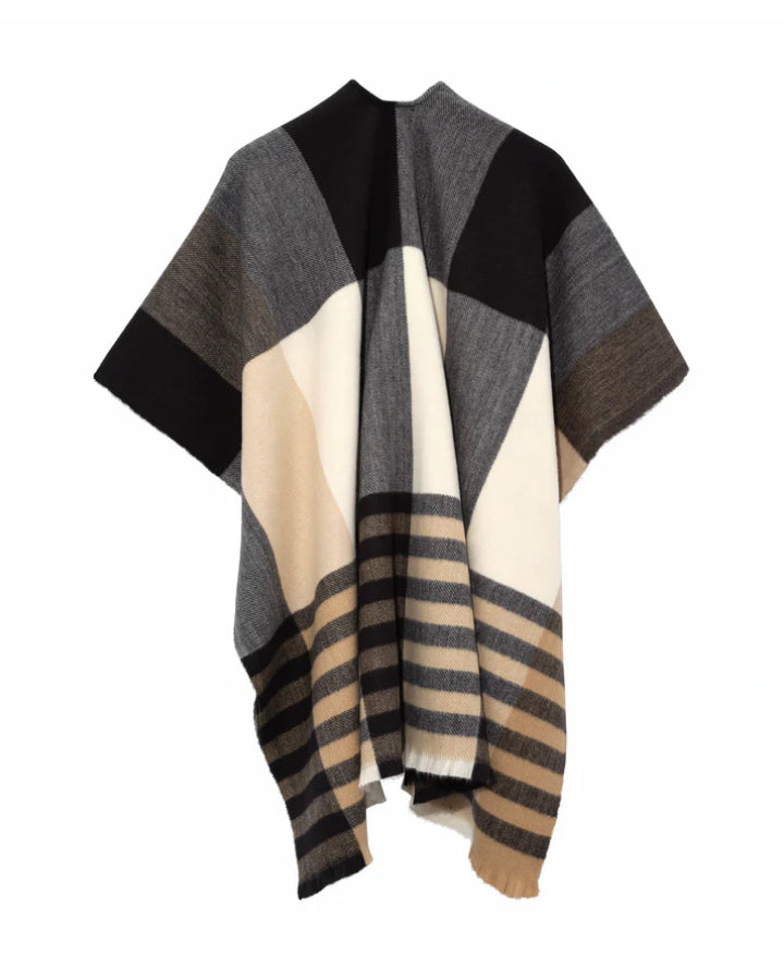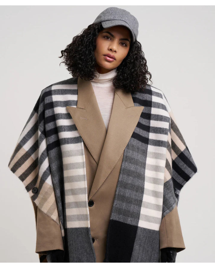Echo paid ruana wrap features an enlarged scale for a bold, modern statement. Side buttons and buttonholes add versatility—wear it fastened to secure on the shoulders or unbuttoned for an effortless, draped look. Length 30".