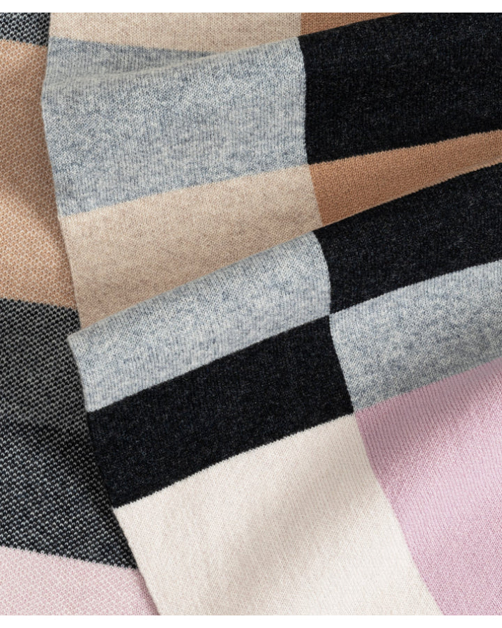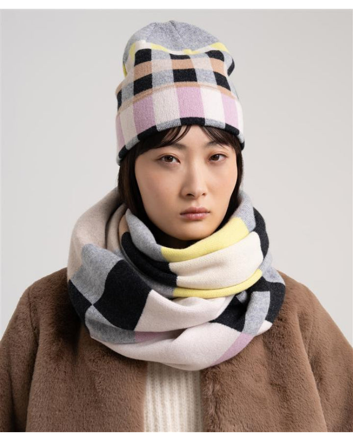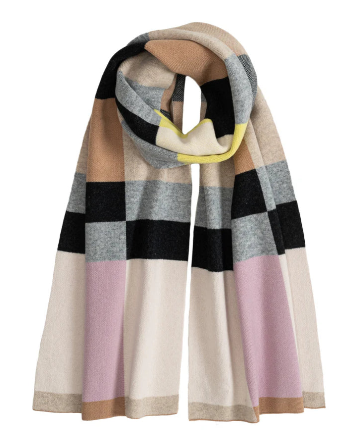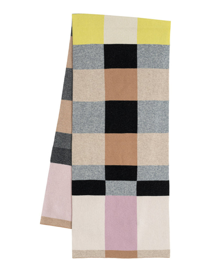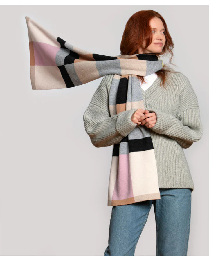 Echo wool geo dynamic grid pattern scarf. Dimensions: 15" x 72".
