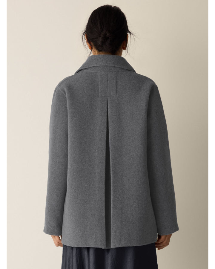 Eileen Fisher short silhouette double face wool trench coat with notch collar, collar, button front with corozo buttons, inverted back box pleat and welt pockets. Size S - Length 29".