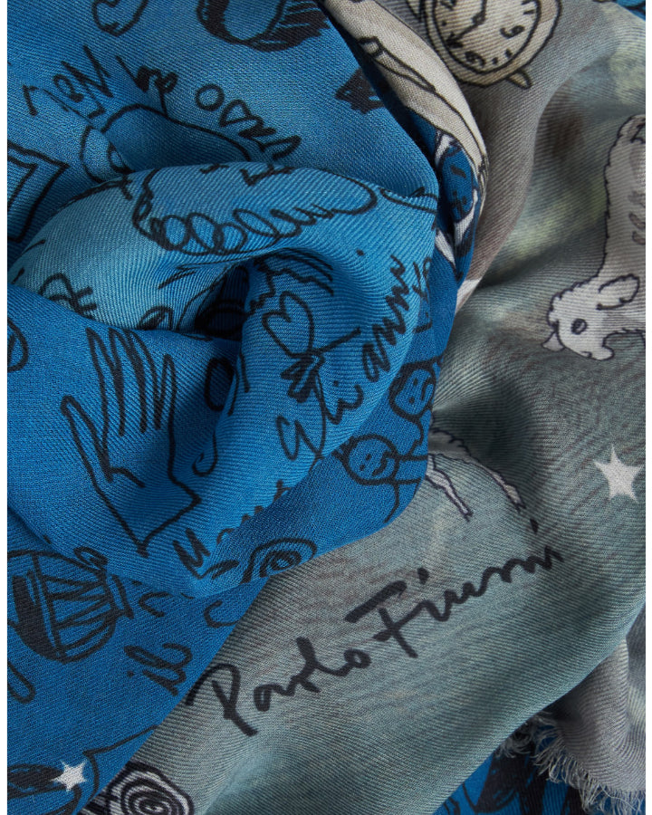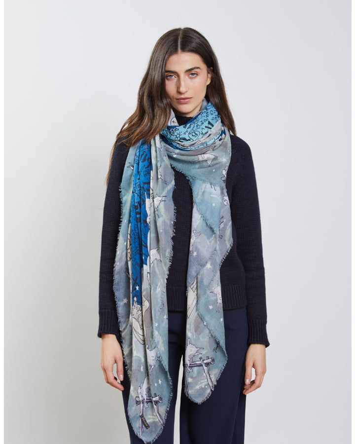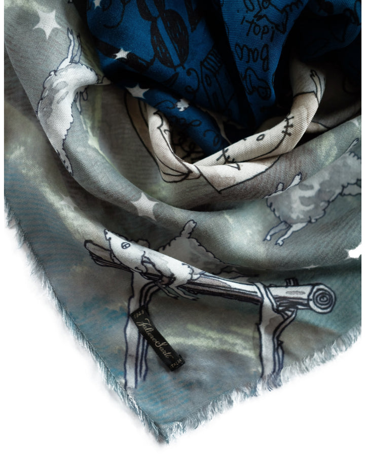 Faliero Sarti modal-cashmere scarf designed in collaboration with the Florentine artist and architect Paolo Fiumi, Sweet Dreams stole portrays a fantastic imagery inspired by the world of dreams. Soft and ethereal colors compose the canvas with evocative words and elements. Dimensions: 140cm x 170cm.