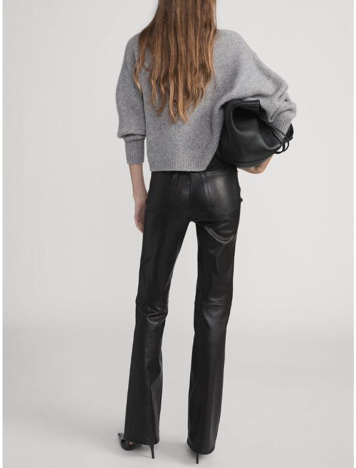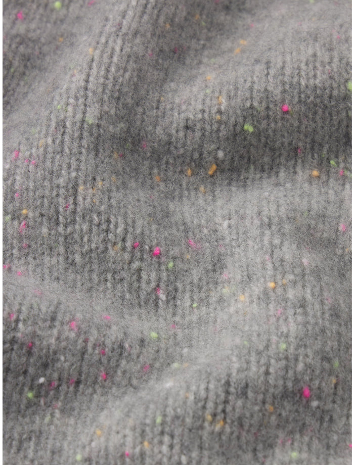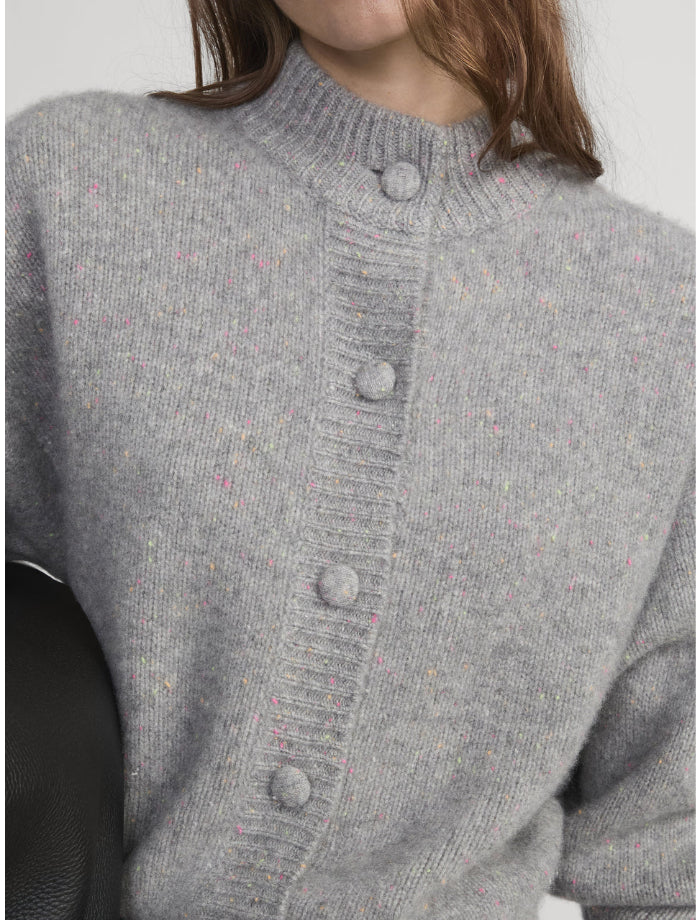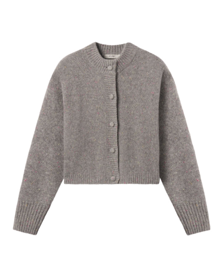 Frame pure cashmere cardigan with cashmere-covered buttons, ribbed neck, cuff, and hem, and grey yarn speckled with multi-coloured threads throughout.