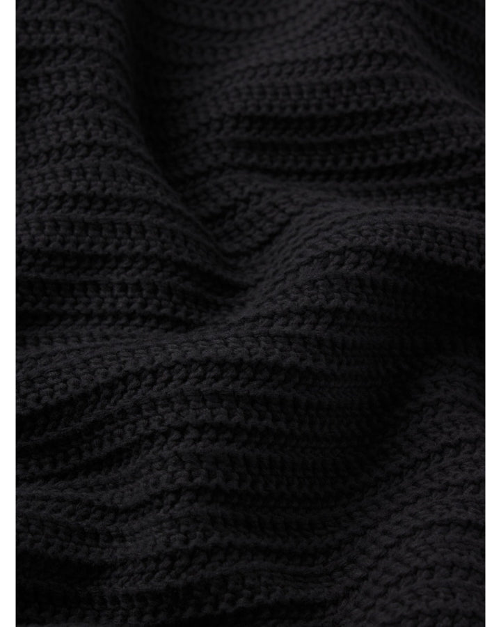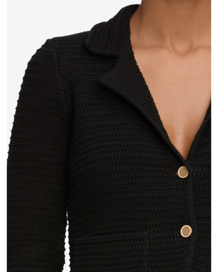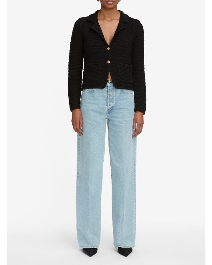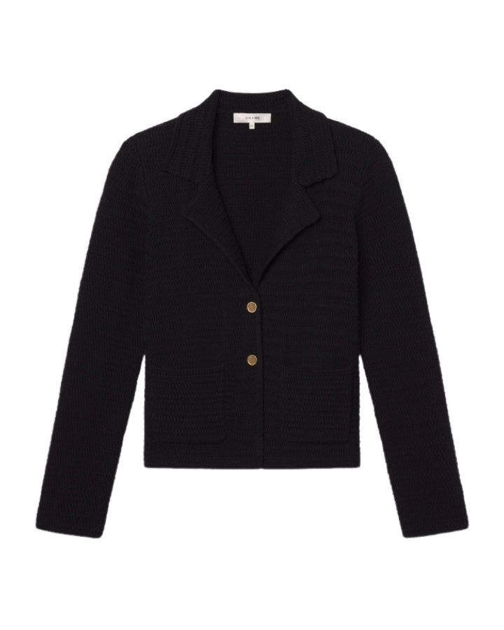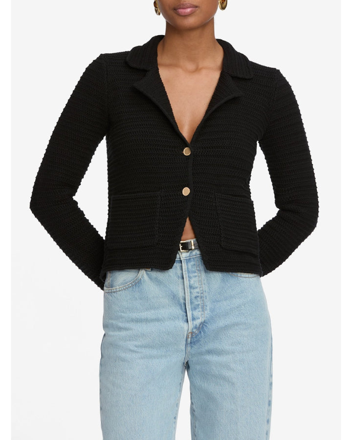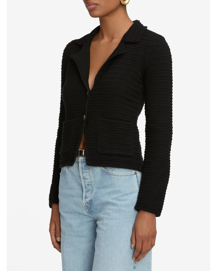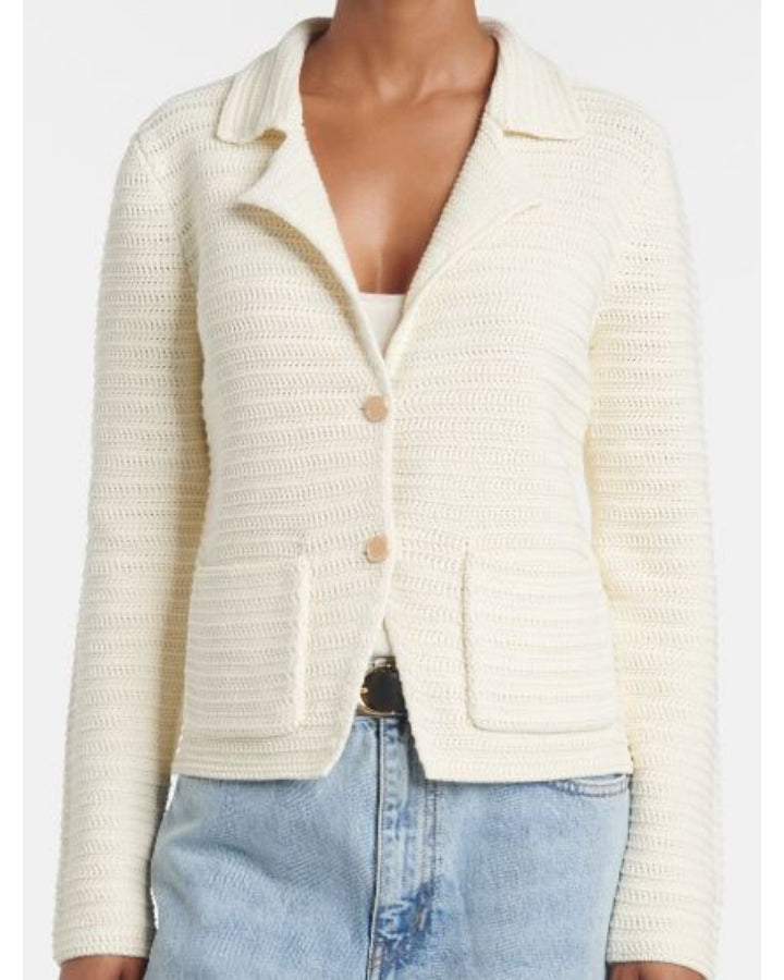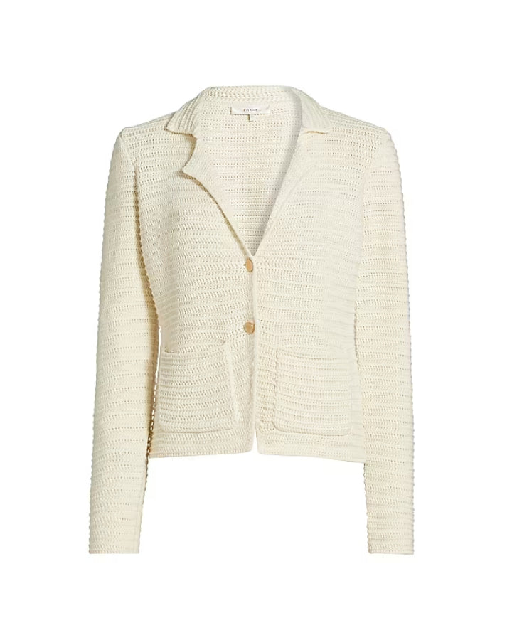 Frame traditionally structured silhouette textured cotton open crochet stitch blazer with peak lapel, patch pockets, 2 button closure and is slightly cropped. Length 21".