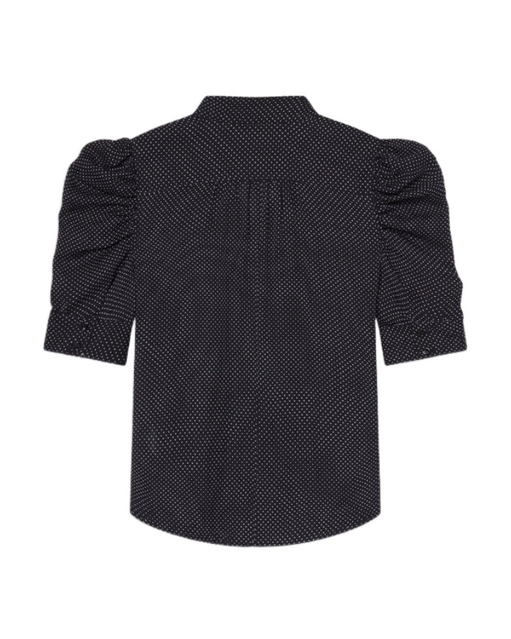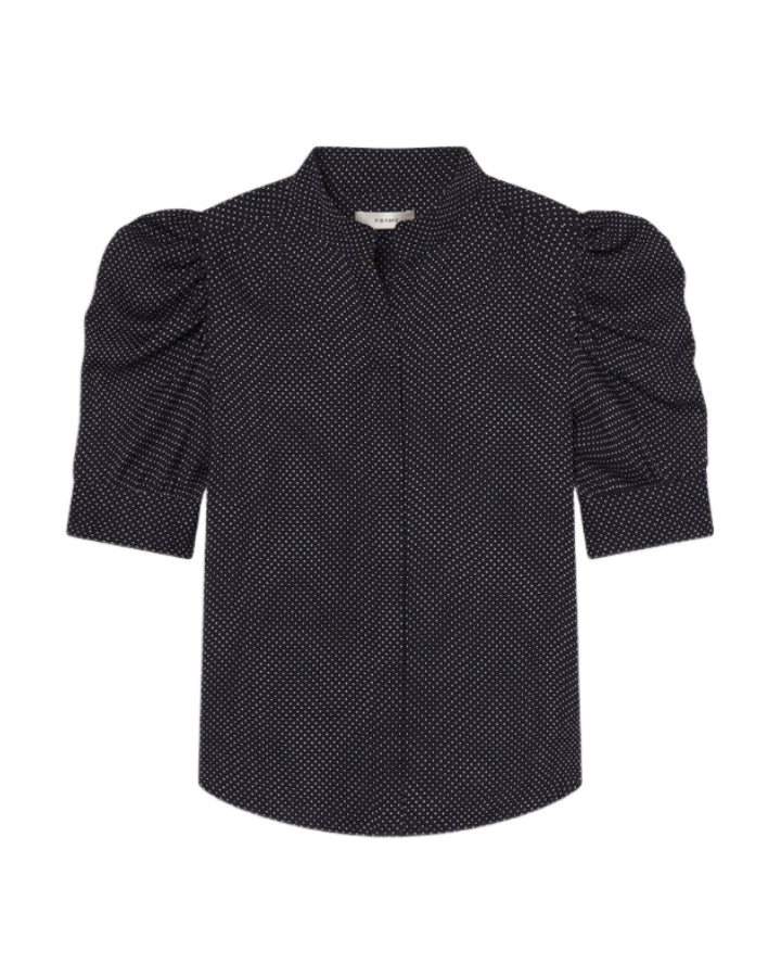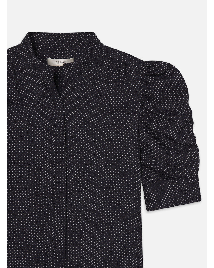 Frame romantic silk polka dot blouse with high neckline, boldly puffed short sleeves with ruched detailing and concealed button placket. Length 25".