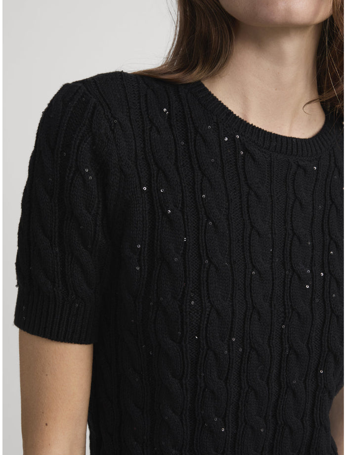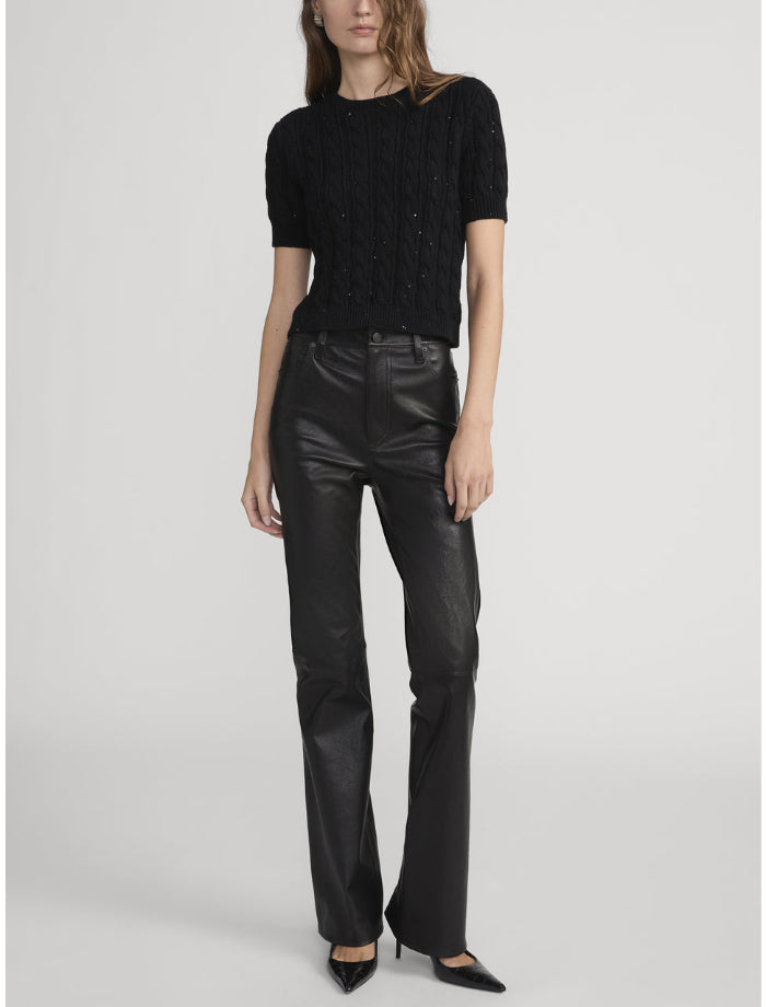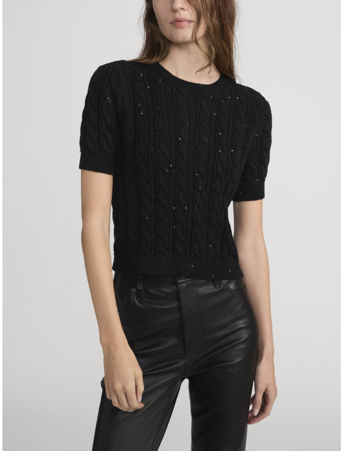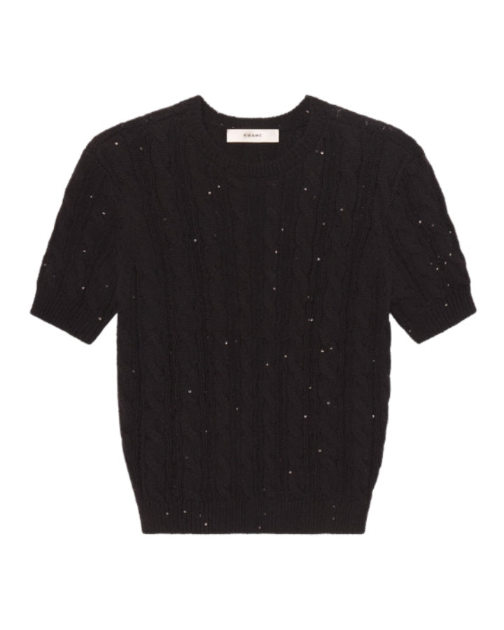 Frame elegant, short-sleeved sweater with a ribbed waistband. Features subtle sequins throughout for a glamourous sparkle.