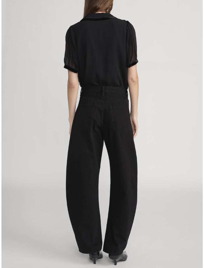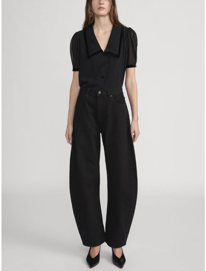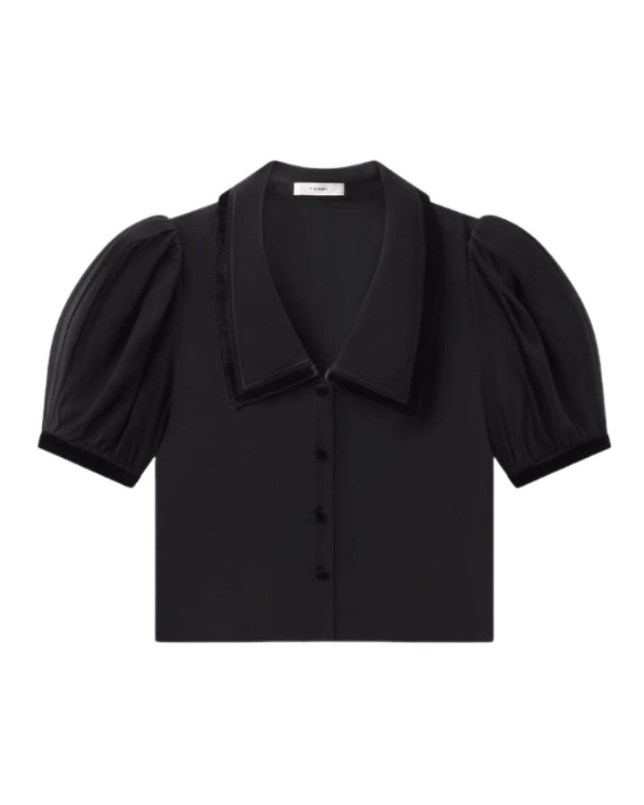 Frame sailor blouse made from pure silk and elevated with velvet trim at the collar. Features slightly puffy feminine sleeves.
