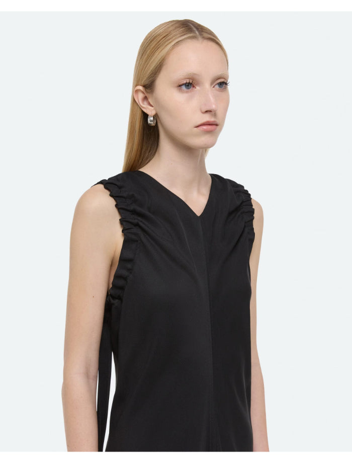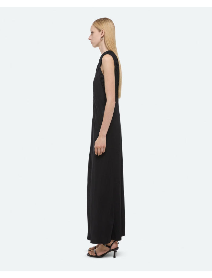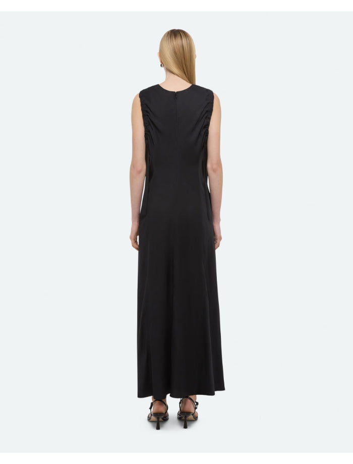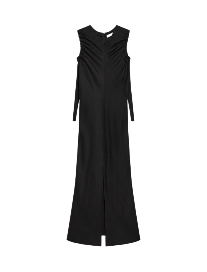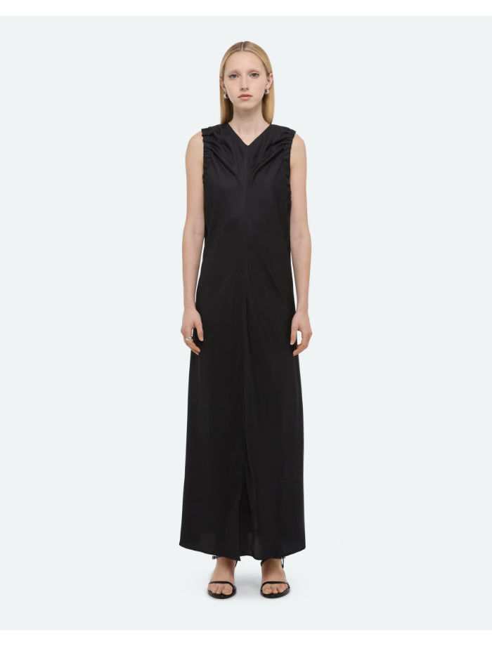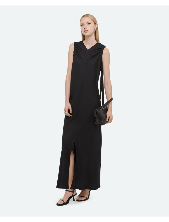 Helmut Lang maxi length dress with an adjustable ruched detail at the arms, a high V-neck, an invisible zipper closure at the back, and slits in front and back for ease of movement.