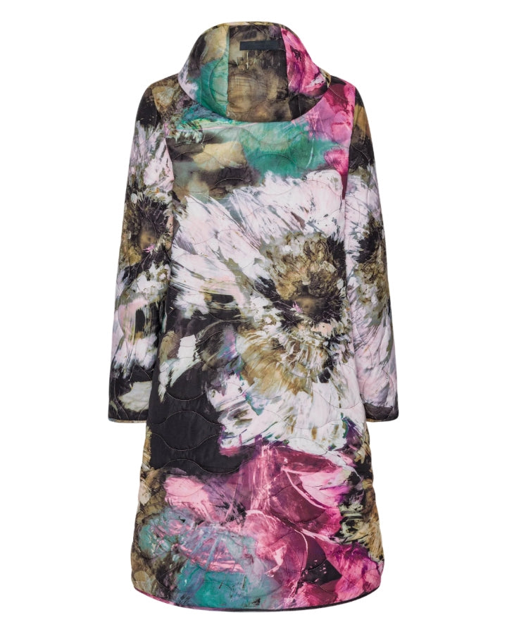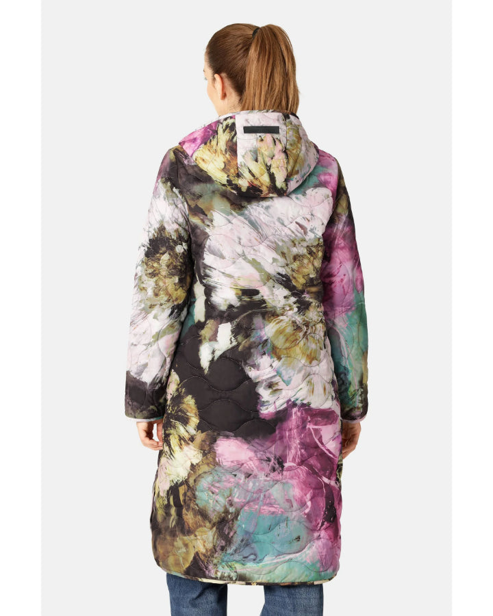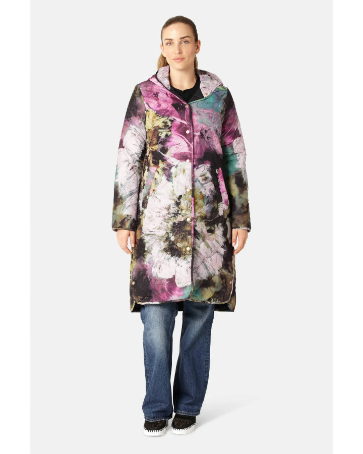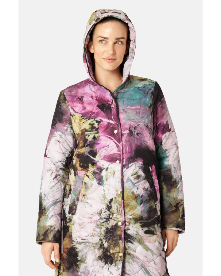 Ilse Jacobsen floral print long quilted hooded coat with soft padding inside, shell fabric is in recycled polyester, a unique quilt pattern highlighted by contrast stitching, front Logo-button closure, Logo at hood and slits at side seam.