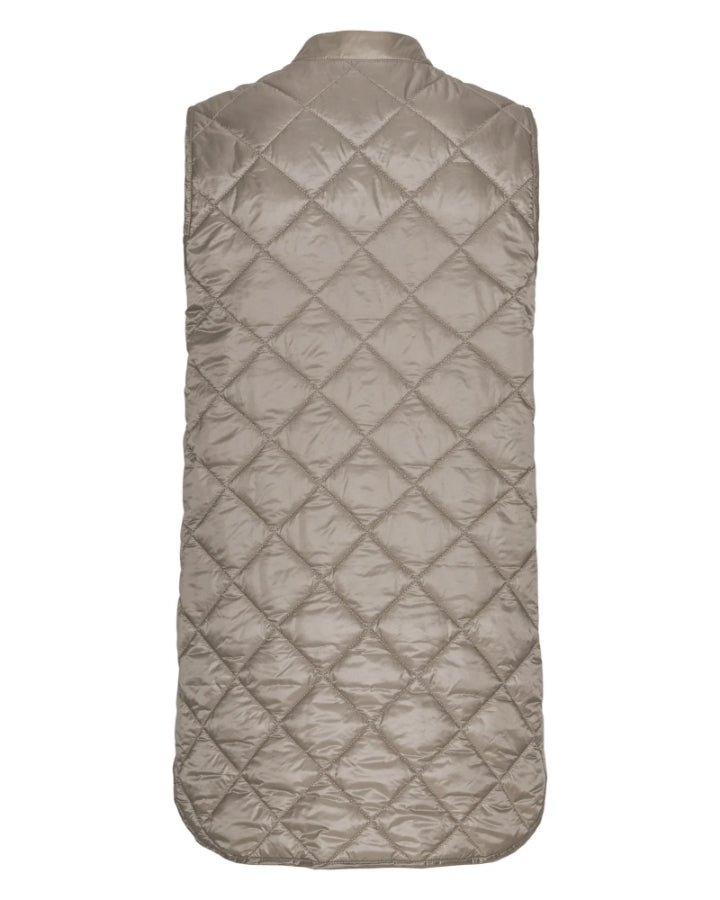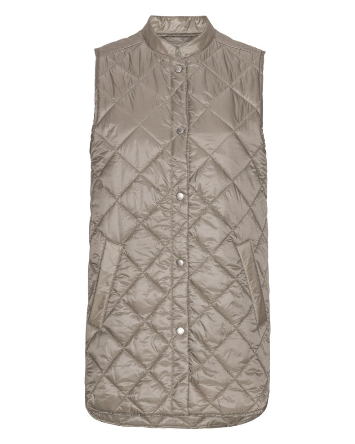 llse Jacobsen short lightweight sleeveless quilted vest is slightly A-shape features press button down closure, front pockets and rounded high-low hem.