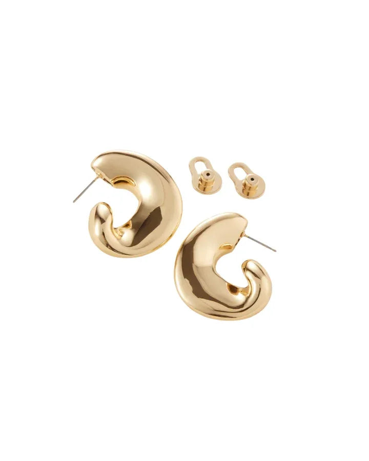Jenny Bird hoop earrings with an organic twist. Hollowed out for a lighter weight, they are paired with Lobe Lifters for additional support. Finished in high polish gold. Length 1.27", Width 0.39.