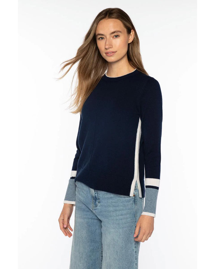 Kinross Cashmere playfully attractive cashmere knit solid color sweater with contrast striped cuff detail, side stripes with side hem slits, crew neck with contrast edging. Elevate your look with this essential piece of luxury cashmere apparel.