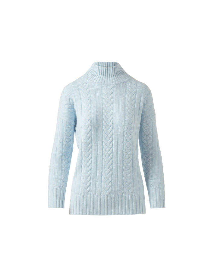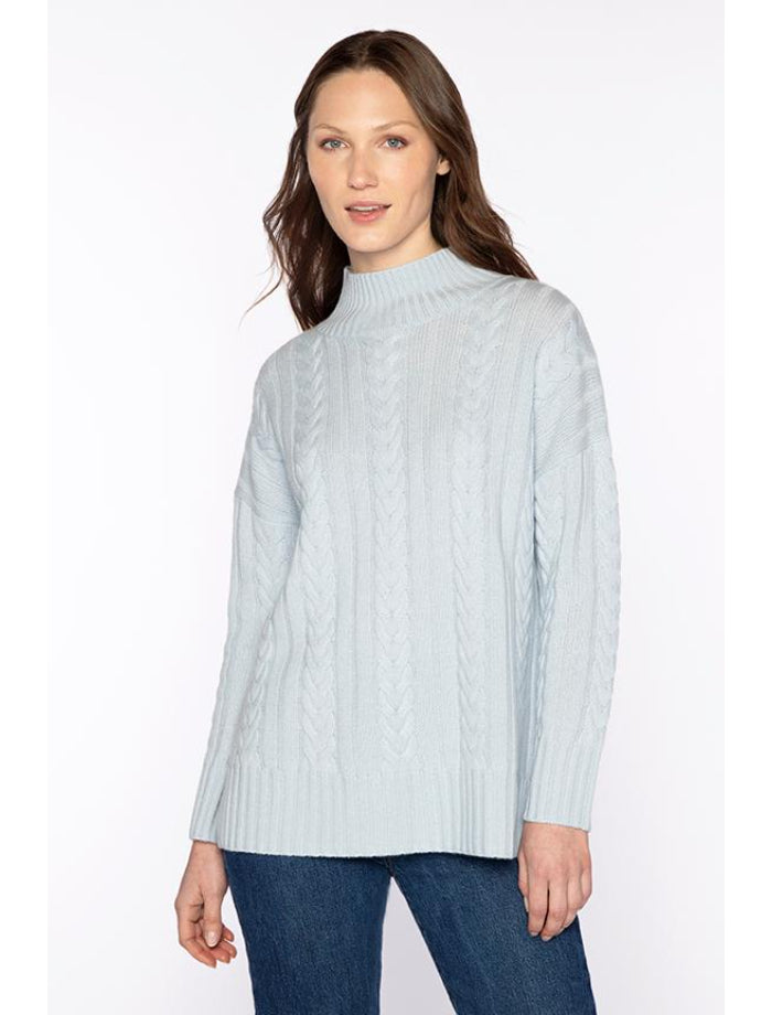 Kinross Cashmere pullover knit in a traditional cable pattern with ribbed cuffs, bottom, and neck. Features a slightly oversized fit, drop shoulders, and a mock neck.