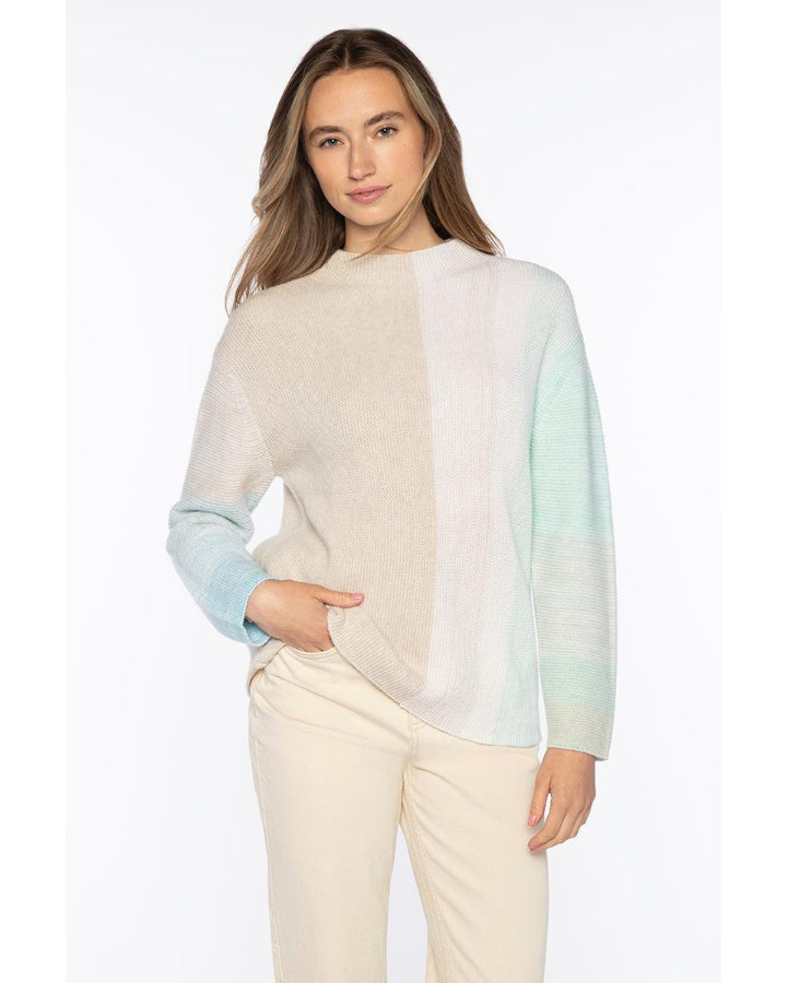 Kinross Cashmere exquisite softness ombre color block sweater with hi neck and drop shoulders.