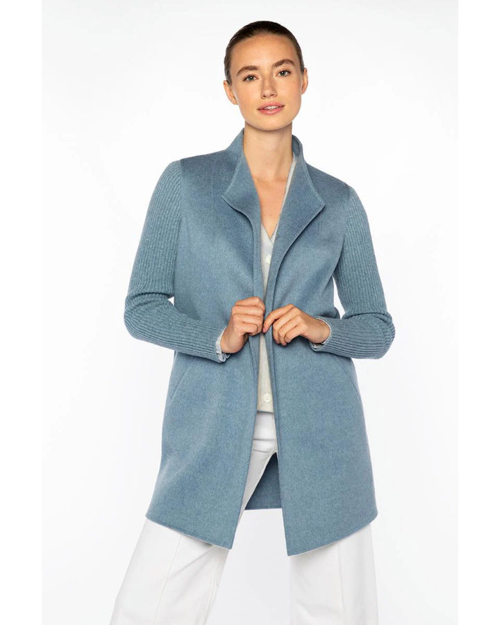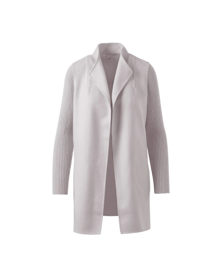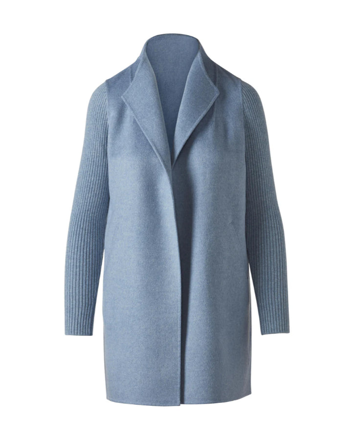 Kinross Cashmere exquisite lightweight wool-cashmere blend jacket offers supreme softness and timeless beauty with and open front design, ribbed sleeves and side welt pockets. Hip length. An essential piece for discerning tastes seeking refined comfort and enduring style.