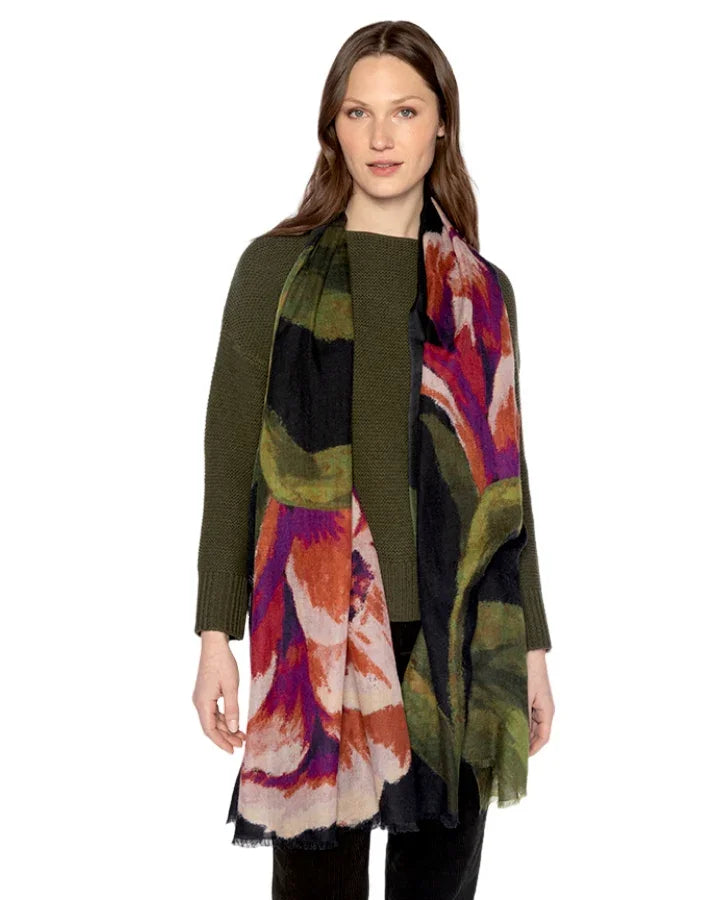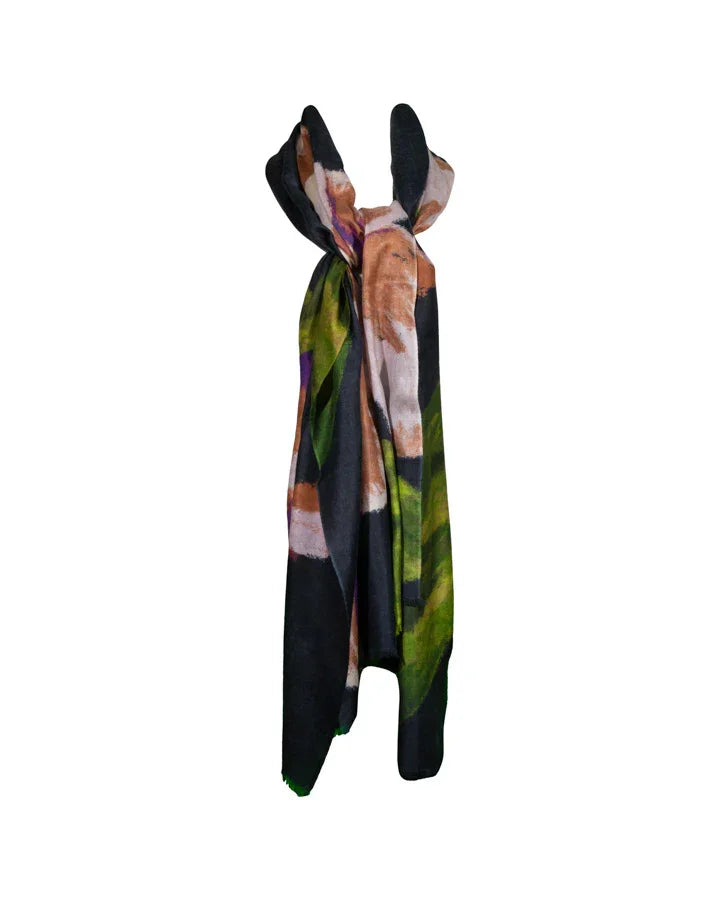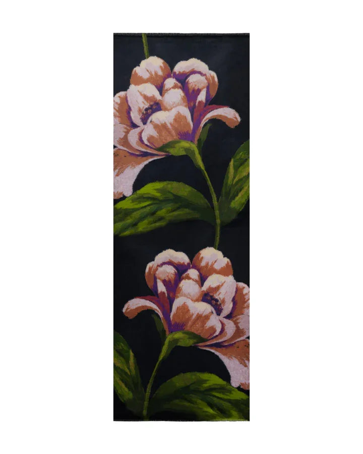 Kinross Fall floral scarf offers an image of a flower in broad painting brushstrokes on a dark background. Ideal as a statement, a memory of flowering season.