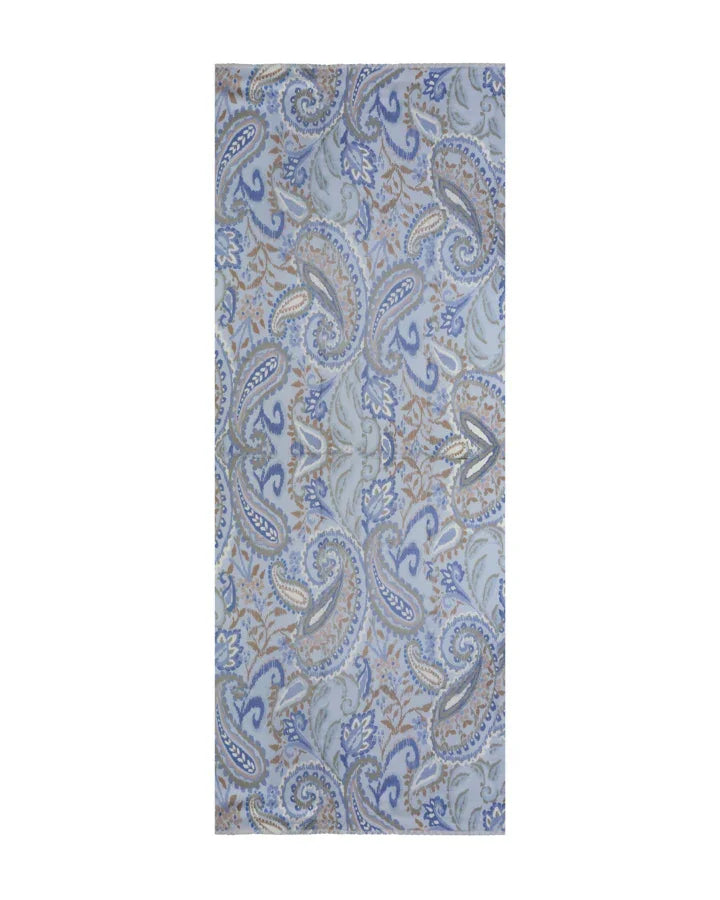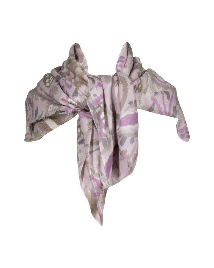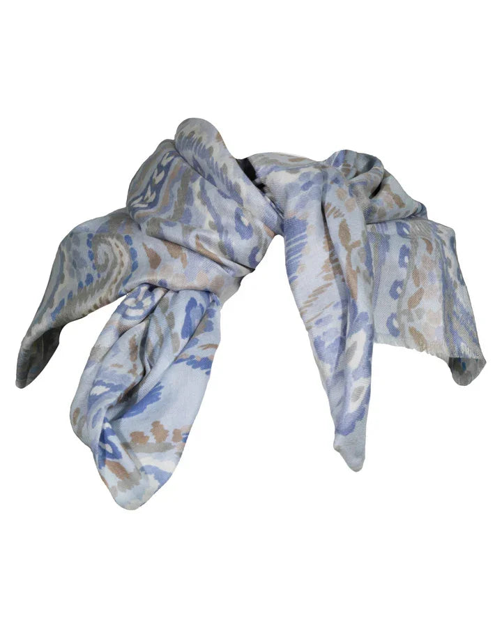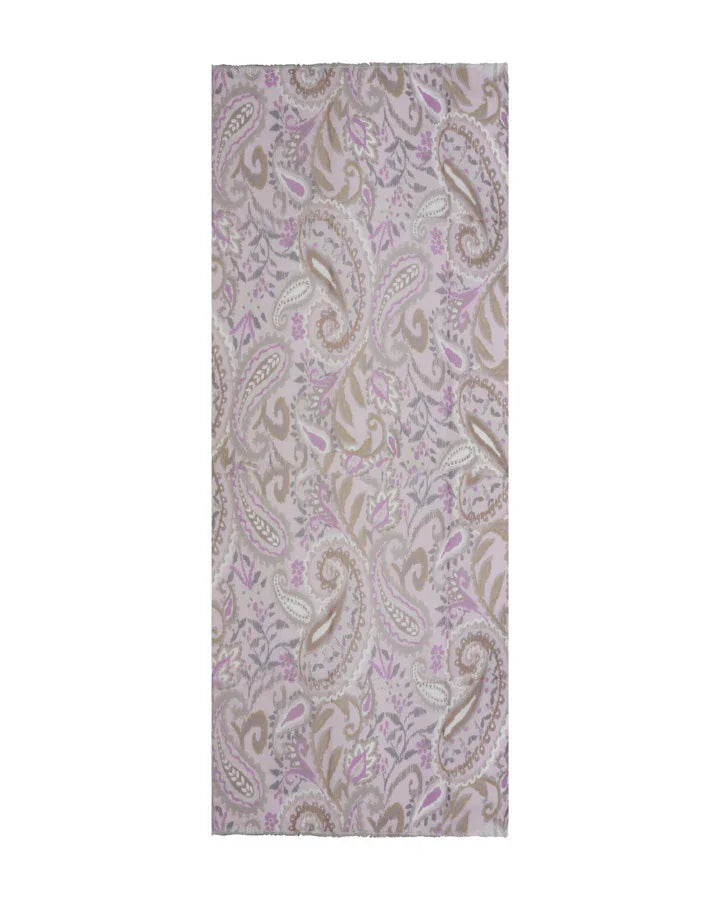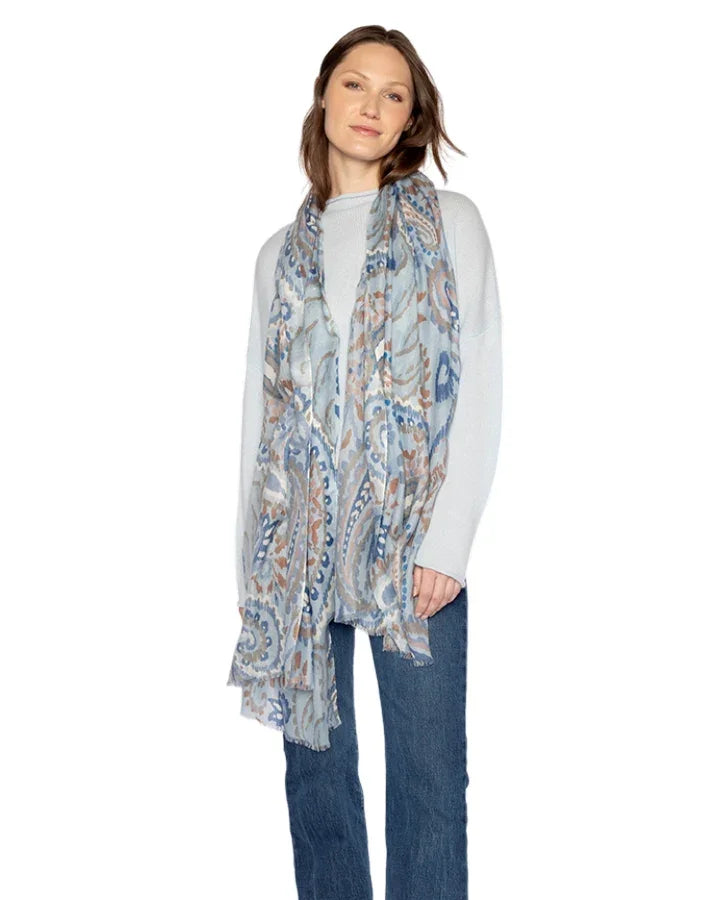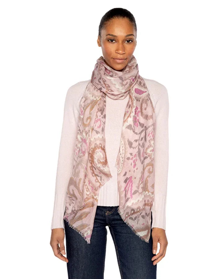 Kinross scarf with a blooming painted paisley print brings a cheerful, delicate feminine touch to any outfit. Adorned with a soft fringe at the ends for a fluttering edge.