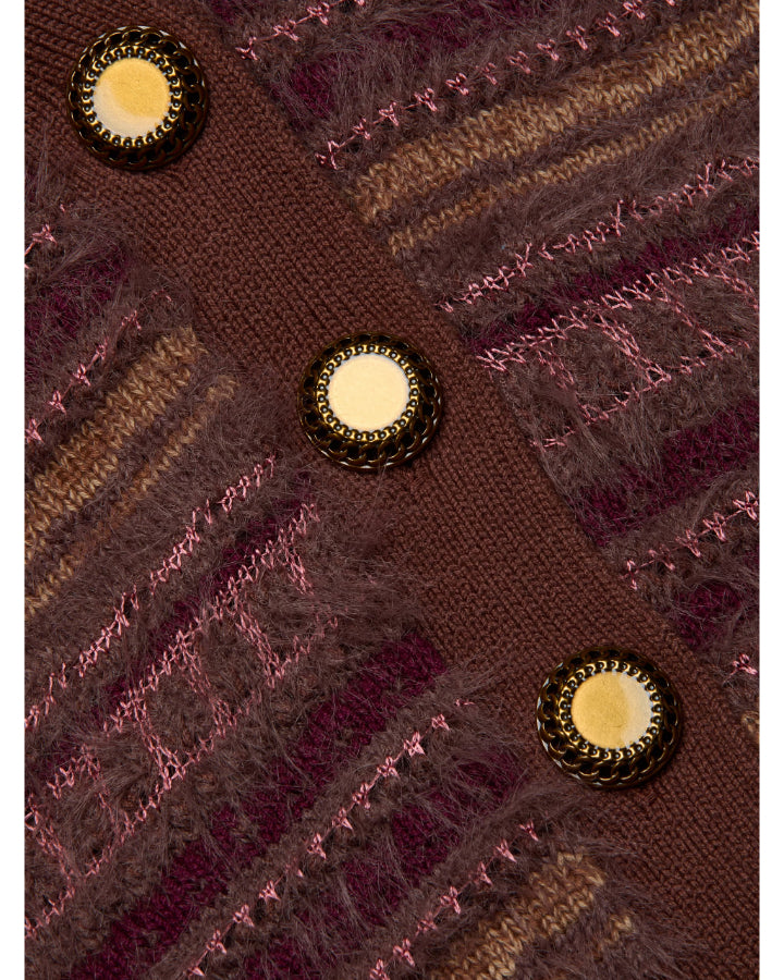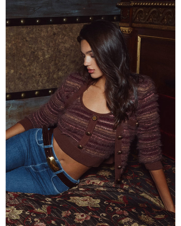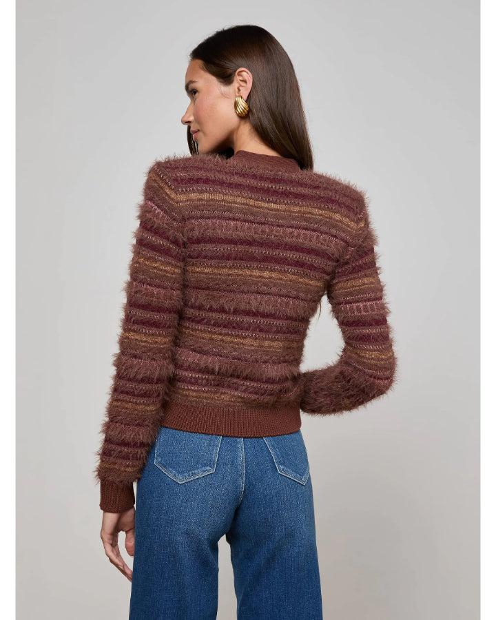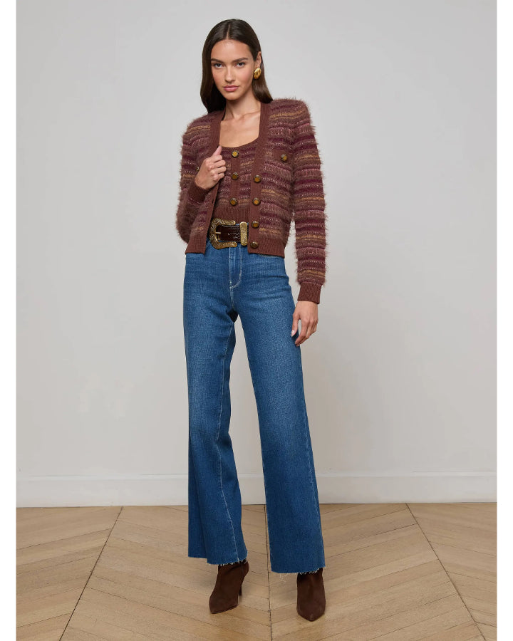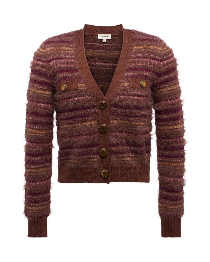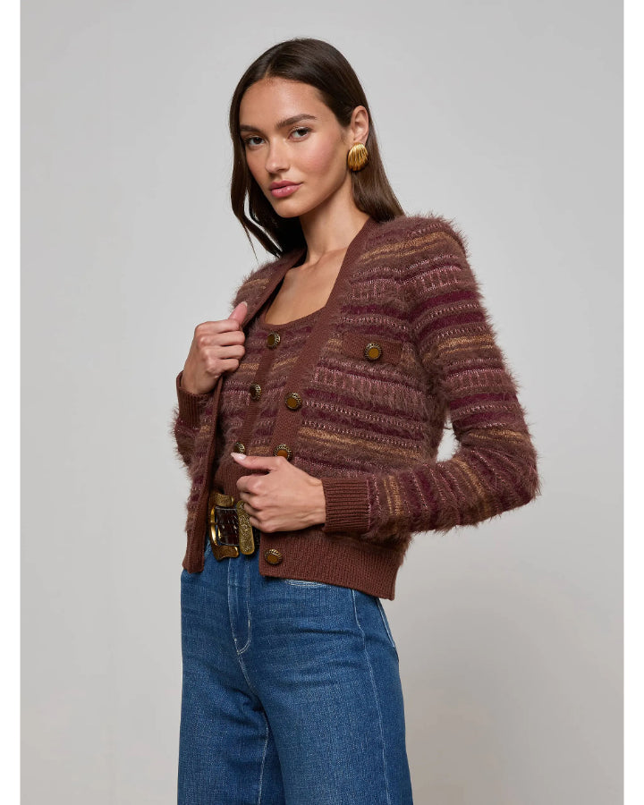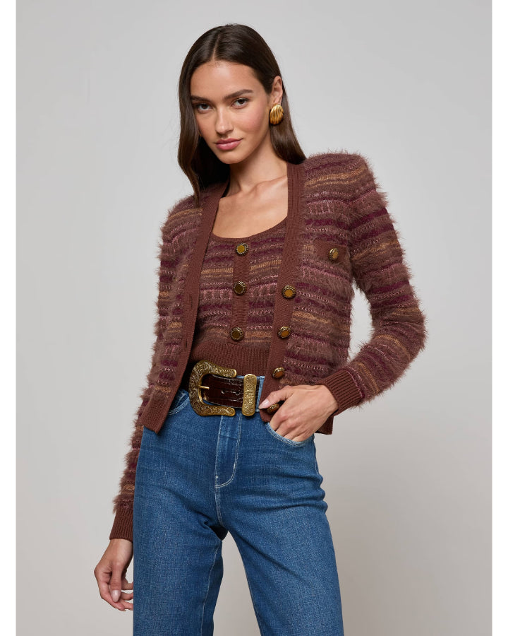 L'Agence soft and striking mixed cotton blend yarns woven cardigan with a variety of eyelash yarns and mixed stitches for textural dimension. With shoulder pads. Finished with vintage-inspired buttons. Size XS - Length 20", Sleeve Length 23.25".