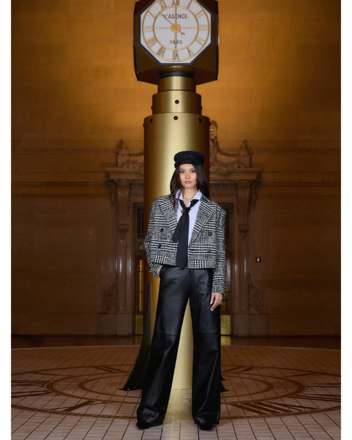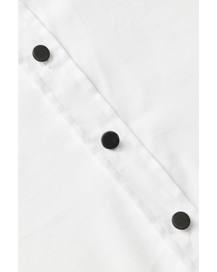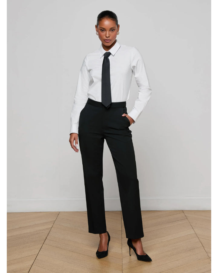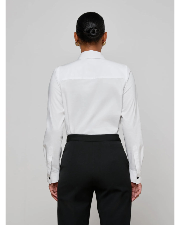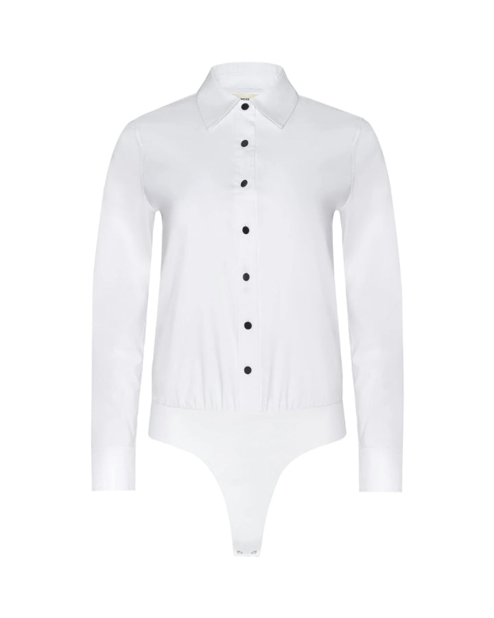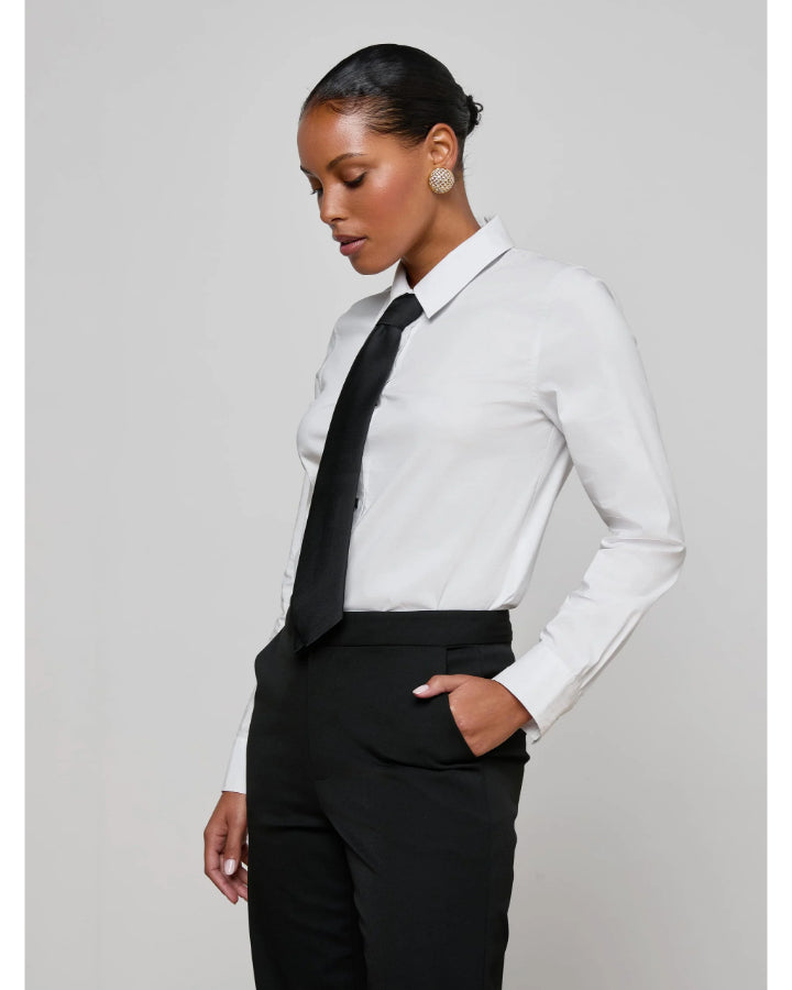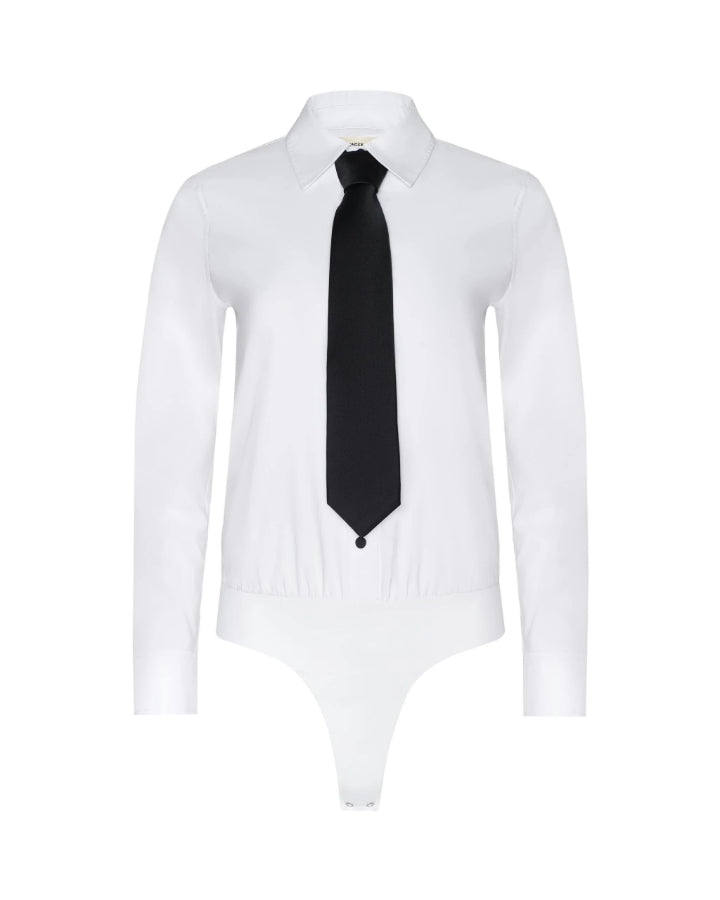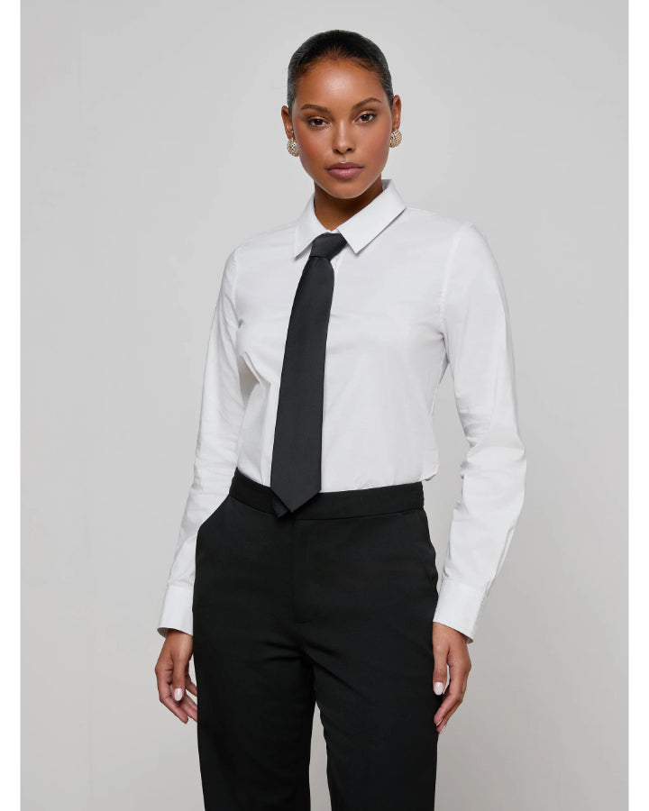 L'Agence organic cotton blend bodysuit makes polished styling effortless. Features a crisp point collar, sleek long sleeves, a removable black tie and gusset snap closure, all in one streamlined piece. Size XS - Length 21.4" From Shoulders to Waist, Sleeve Length 23.8".