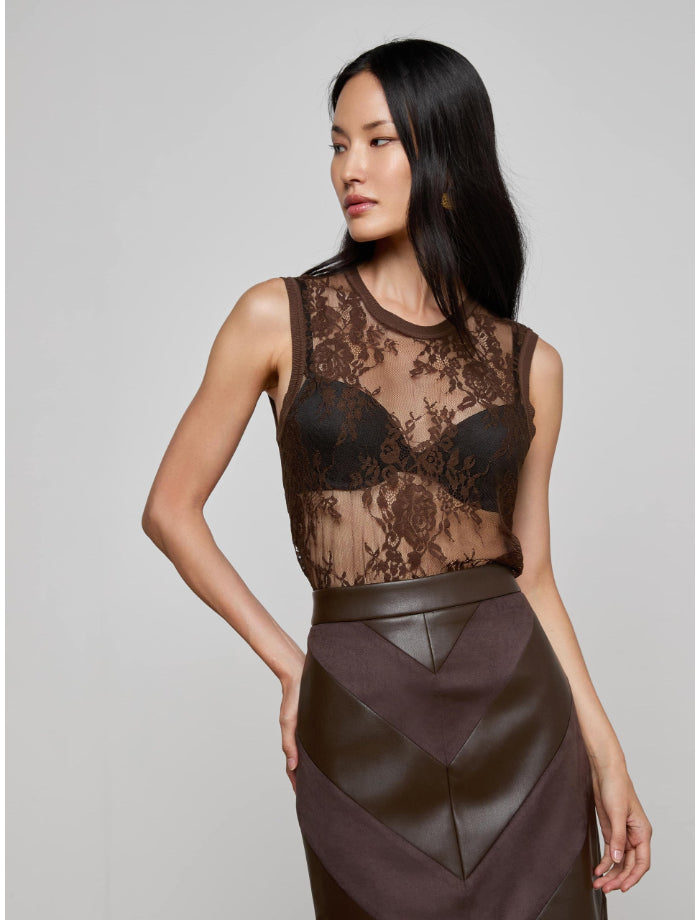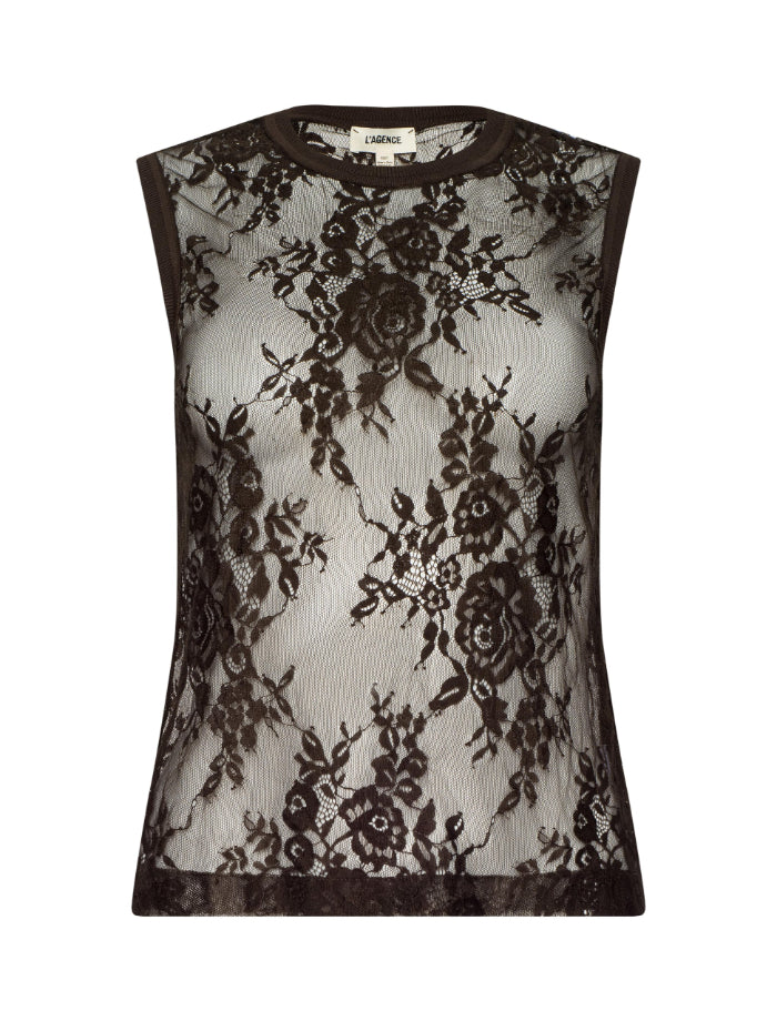 L'Agence Brax sheer Chantilly lace muscle tank top with a floral pattern and a solid ribbed rim.