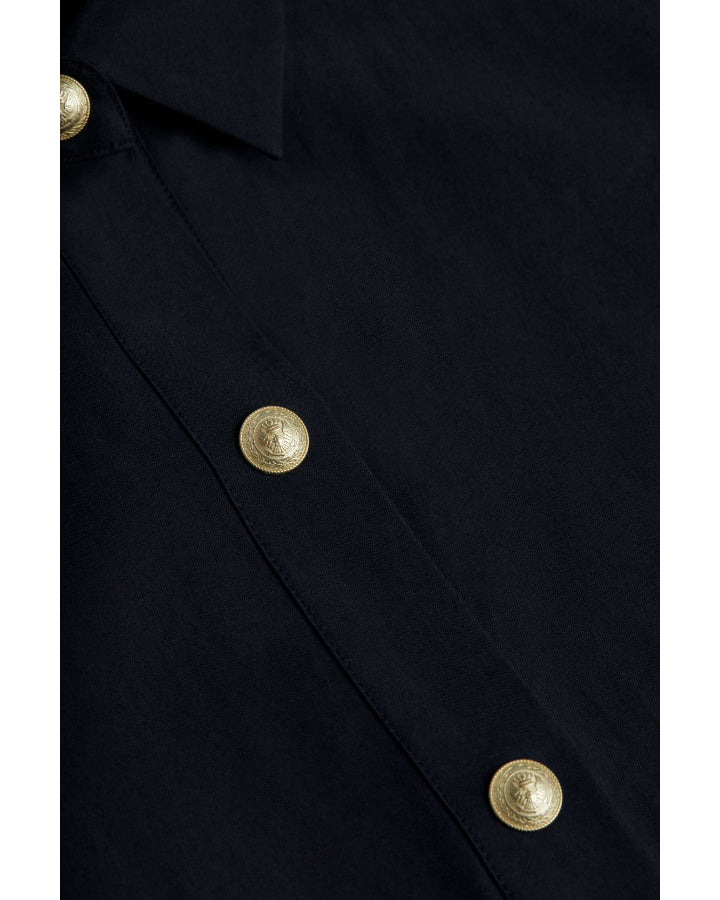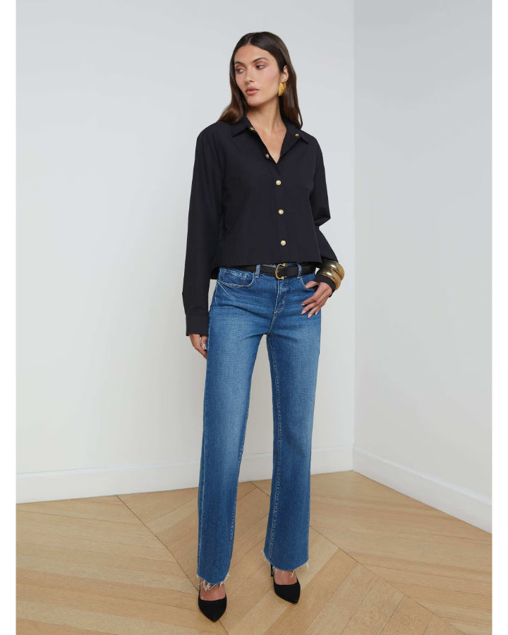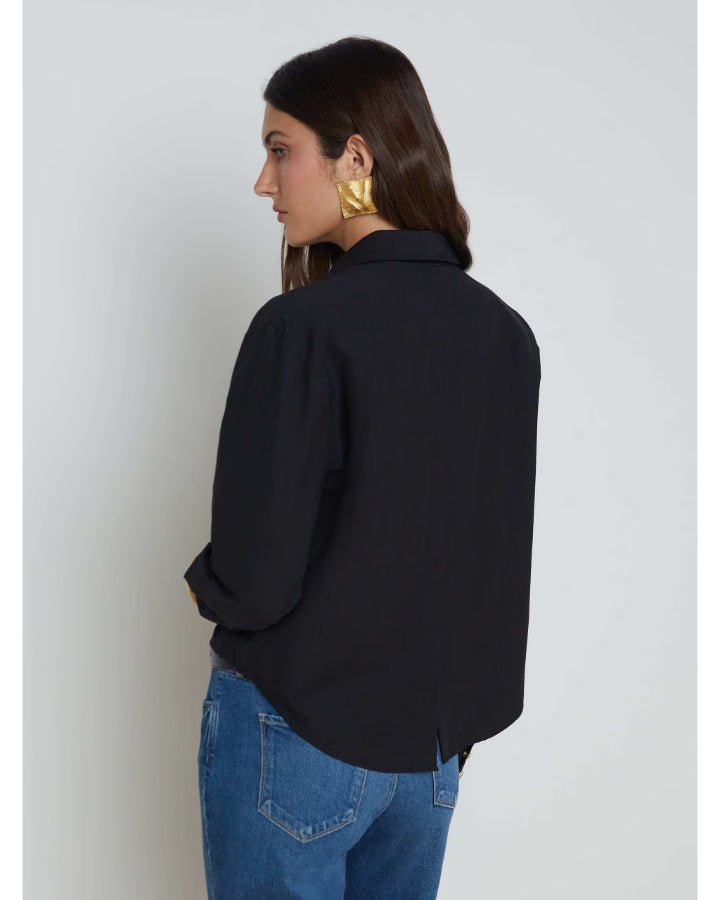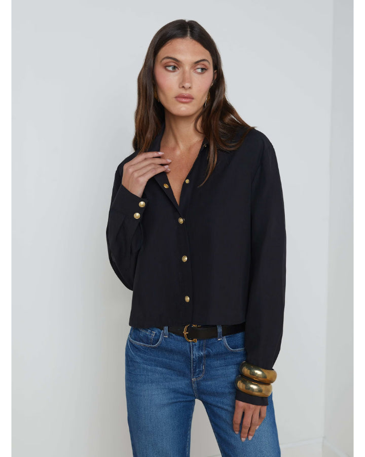 L'Agence classic stretch cotton blend tailored shirt with a cool, borrowed-from-the-boys fit and miniature snap embossed dome buttons for a touch of glamour. In a cropped length with a high low hem. Size XS - Length 19.5", Sleeve Length 23.25".