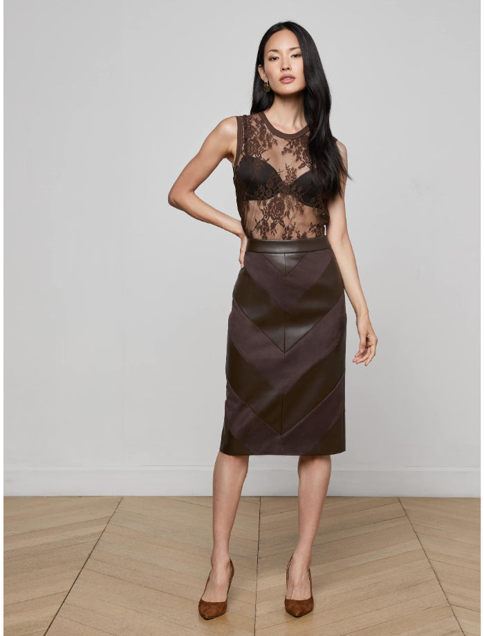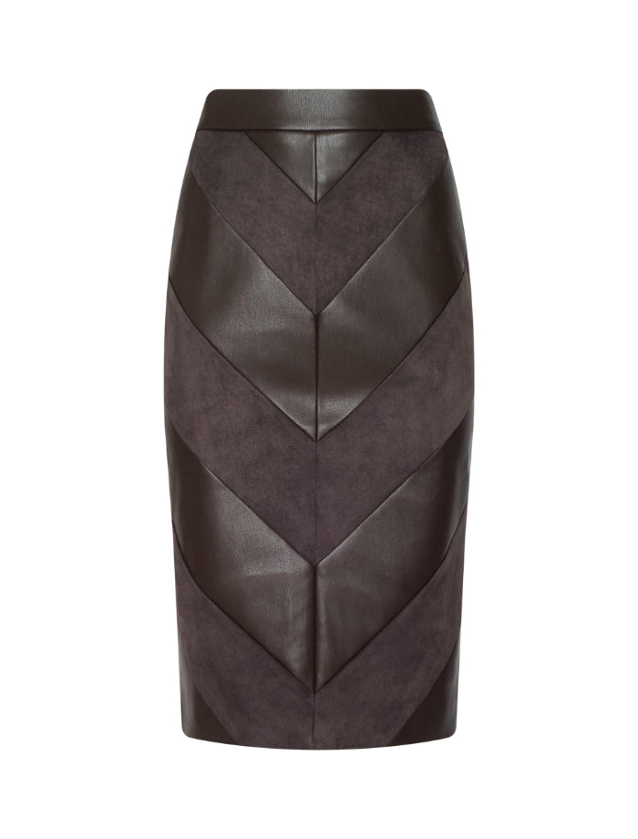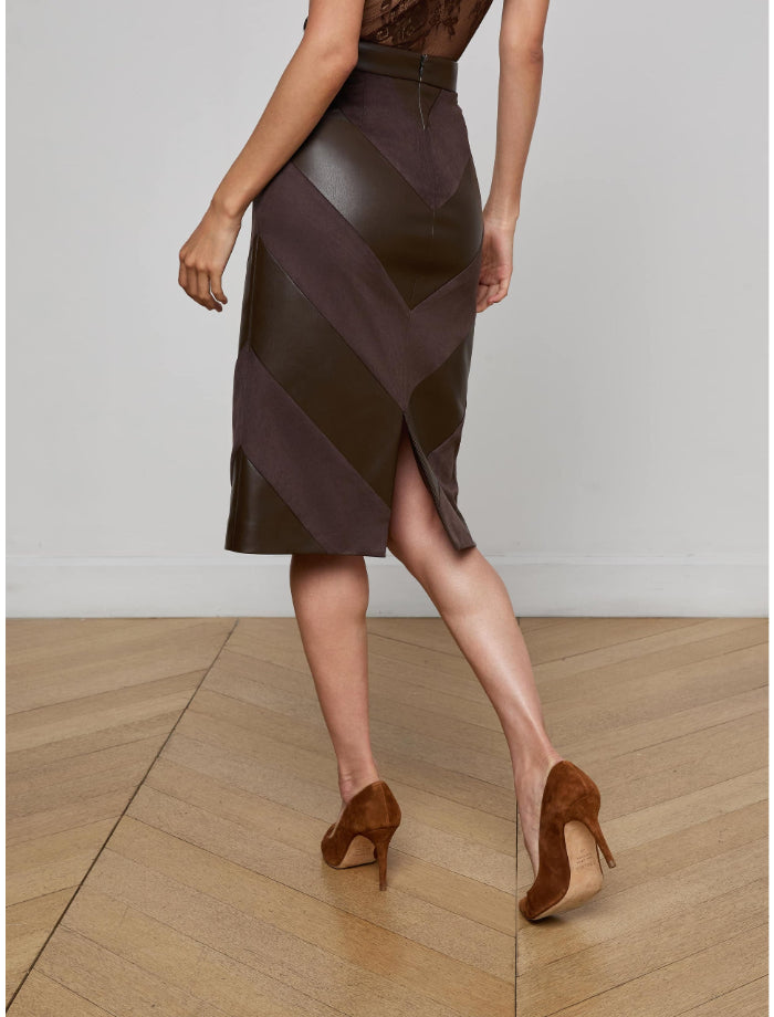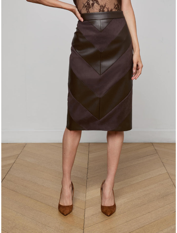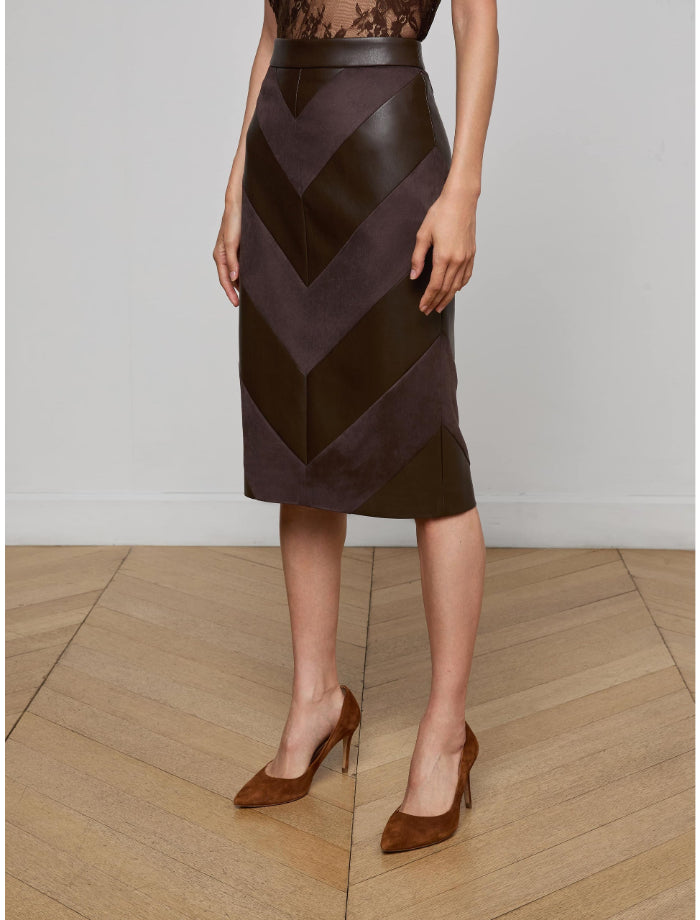 L'Agence Erma pencil skirt in vegan leather and suede features a patchwork design with its chevron pattern. Slim silhouette.