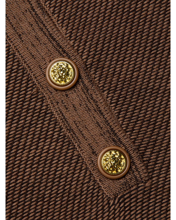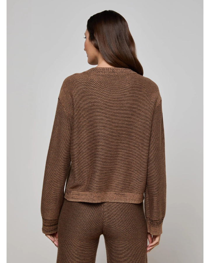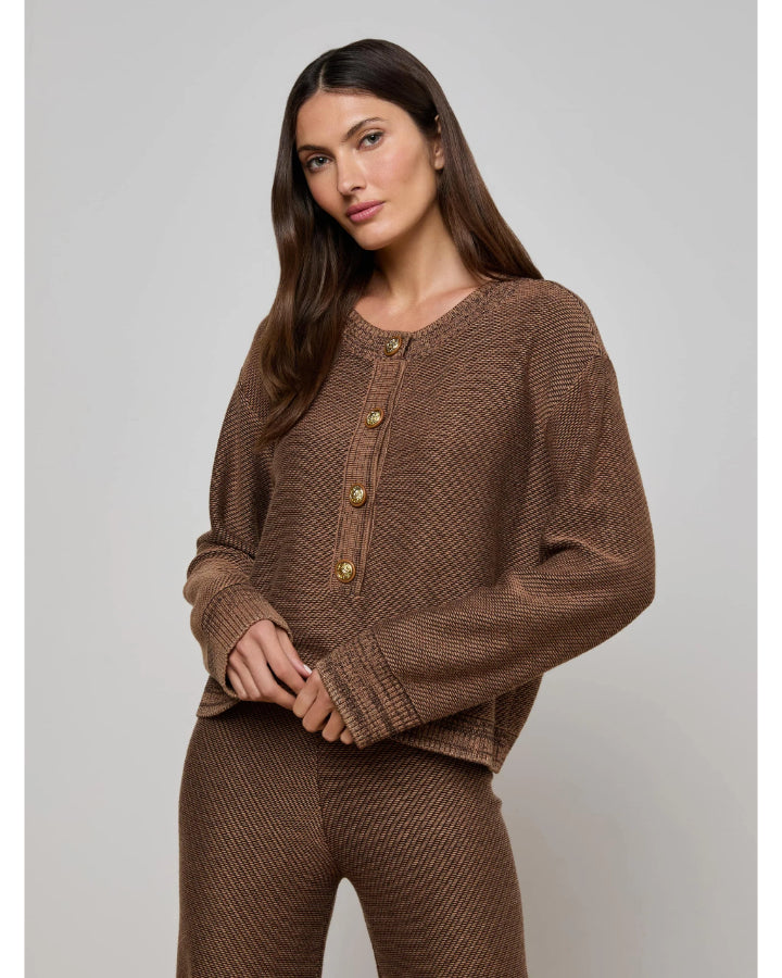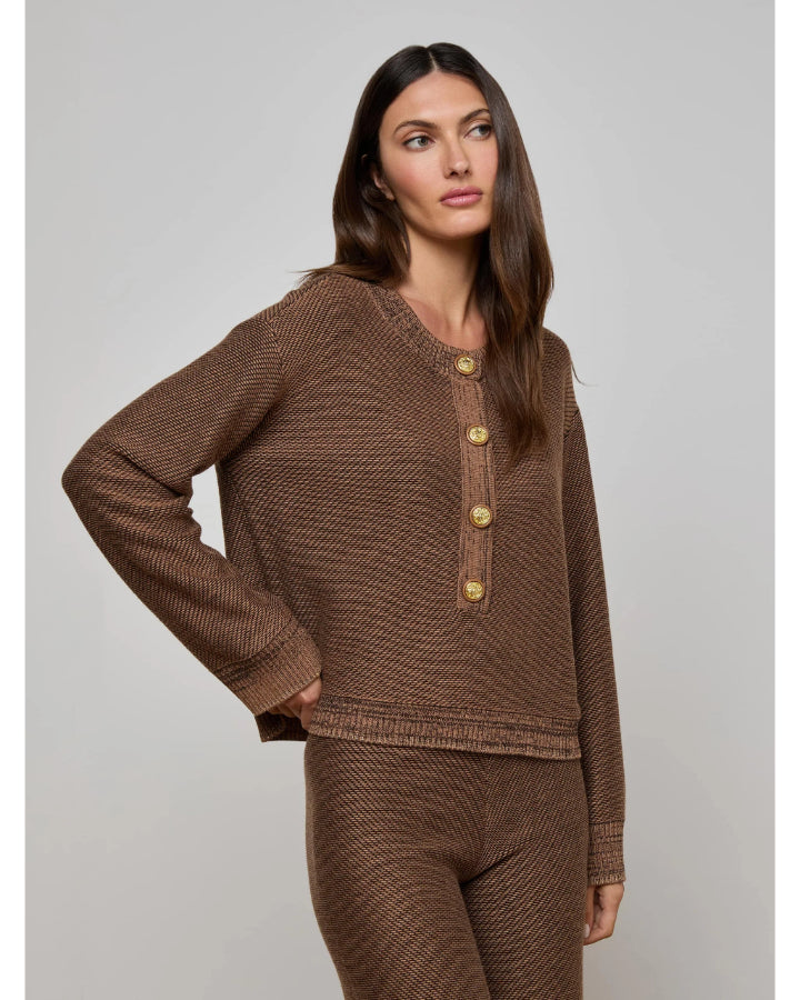 L'Agence relaxed, soft feel knit henley sweater with a hint of cashmere, round neck and ribbed trim. The rich loop texture and subtle two-tone effect give it dimension, while oversized gold buttons add a bold finish. Size XS - Length 20", Sleeve Length 28.8".