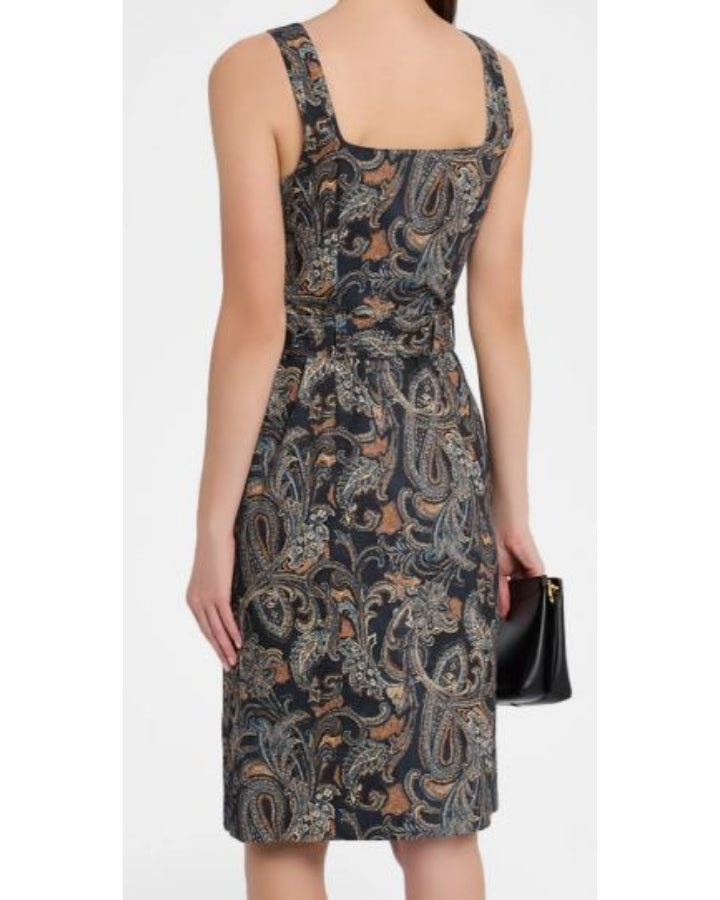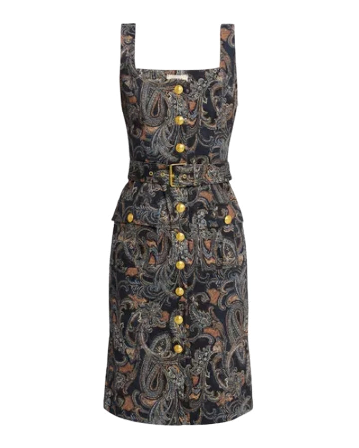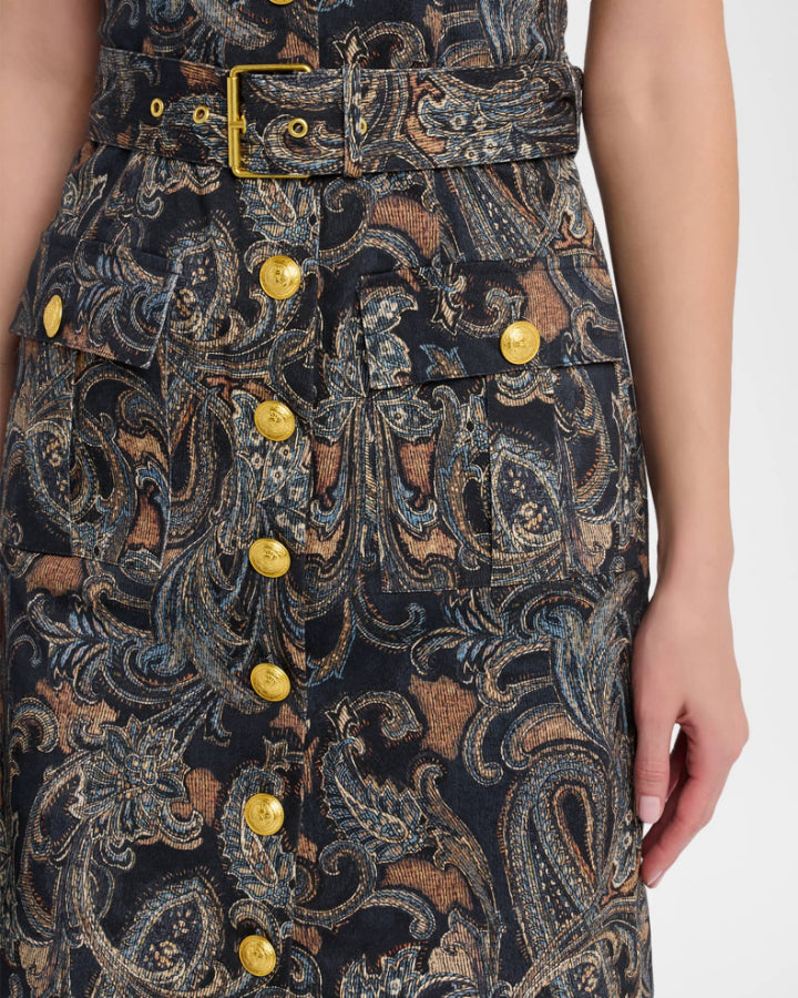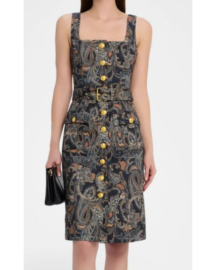 L'Agence sheath silhouette stretch cotton allover paisley print sleeveless dress with a square neckline, hip flap patch pockets, dome button front closure, adjustable print waist belt, hem falls below the knee.