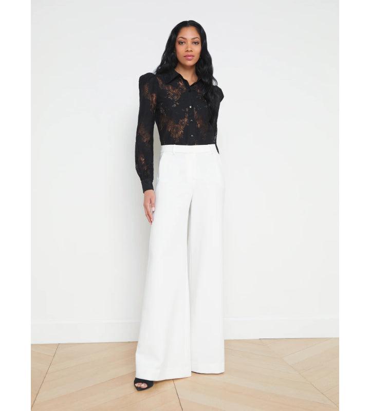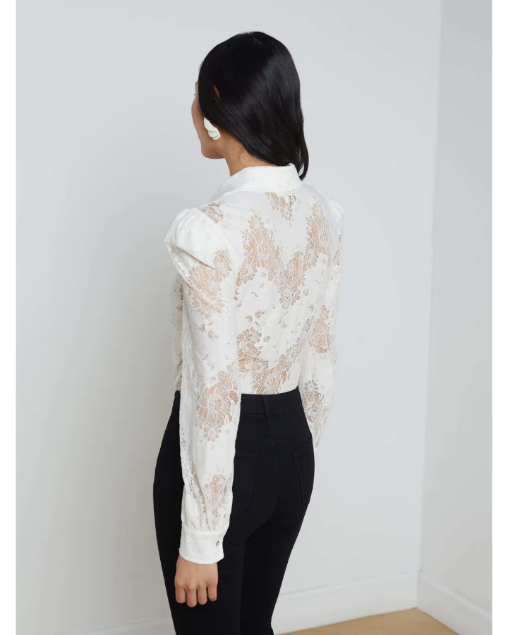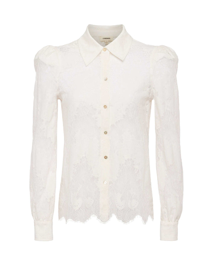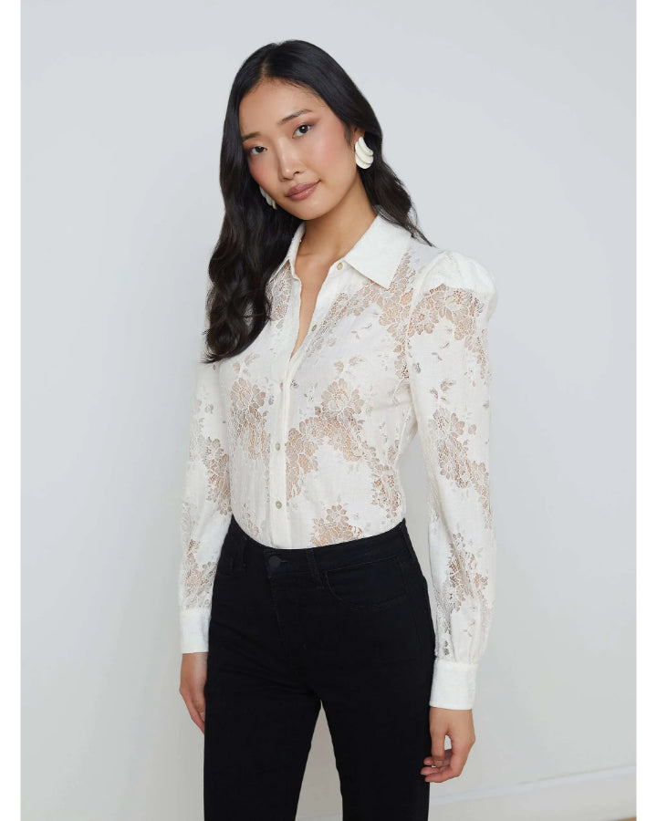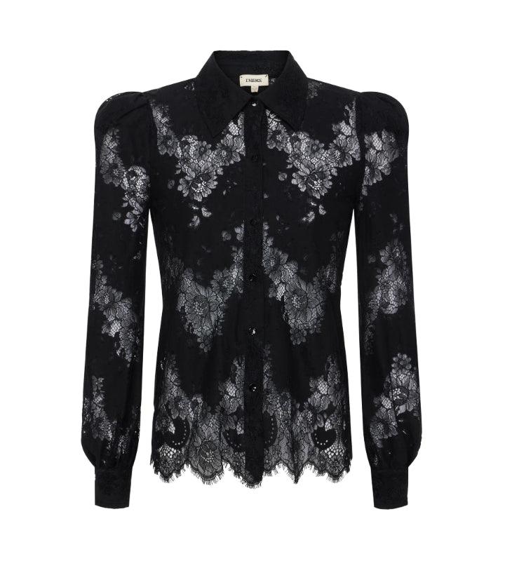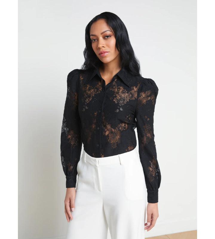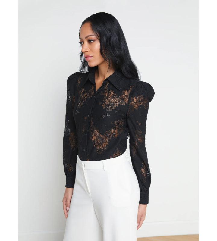 L'Agence elegant most feminine chic black lace blouse with puff shoulders for gentle volume, sharp collar adds definition and front button closure. Size XS - Length 24.5", Sleeve Length 25.5".