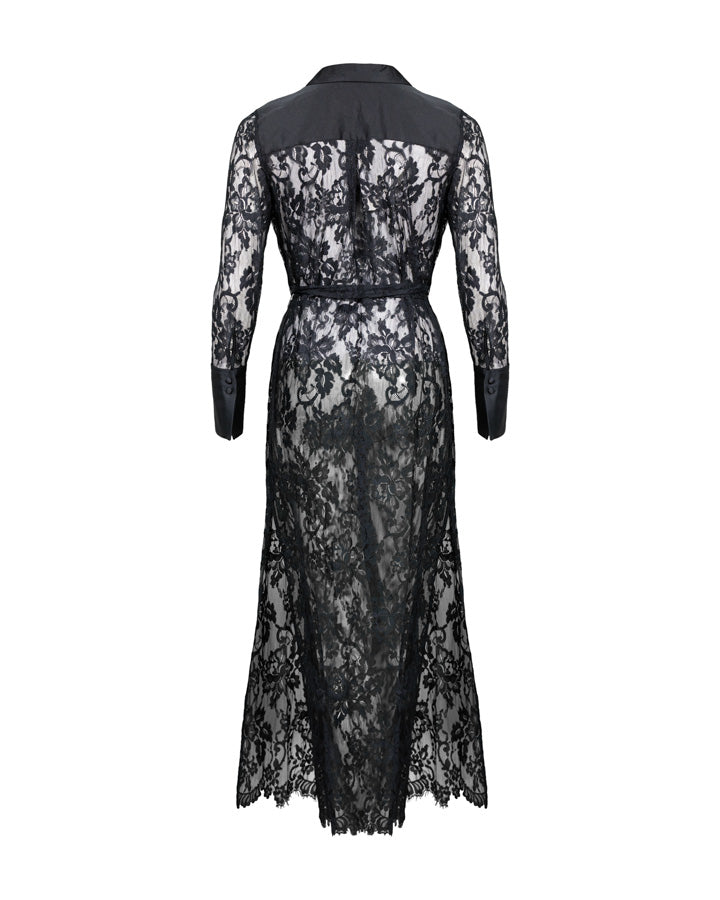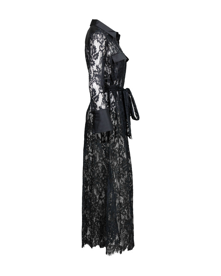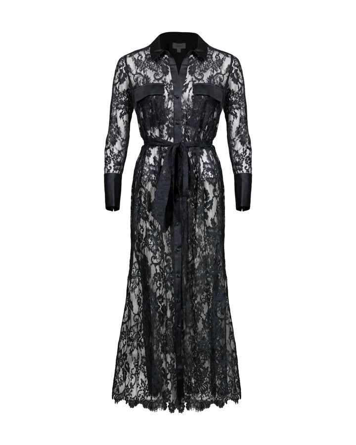 L'Agence Leora dress crafted from delicate lace in a classic shirtdress style, with opaque satin detailing at the closure, cuffs, pockets, collar, and buttons. Features a maxi length and a lace belt.