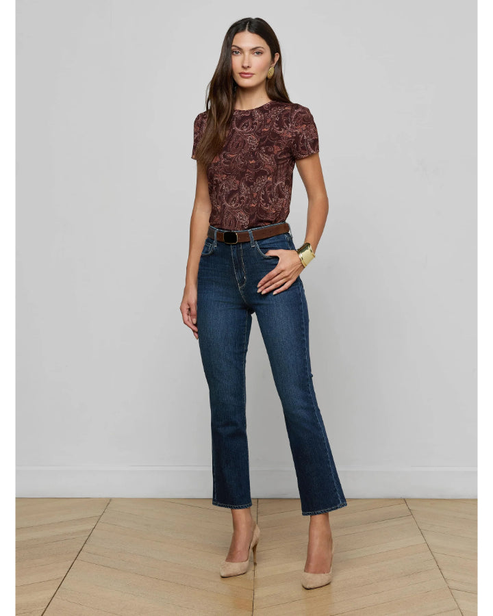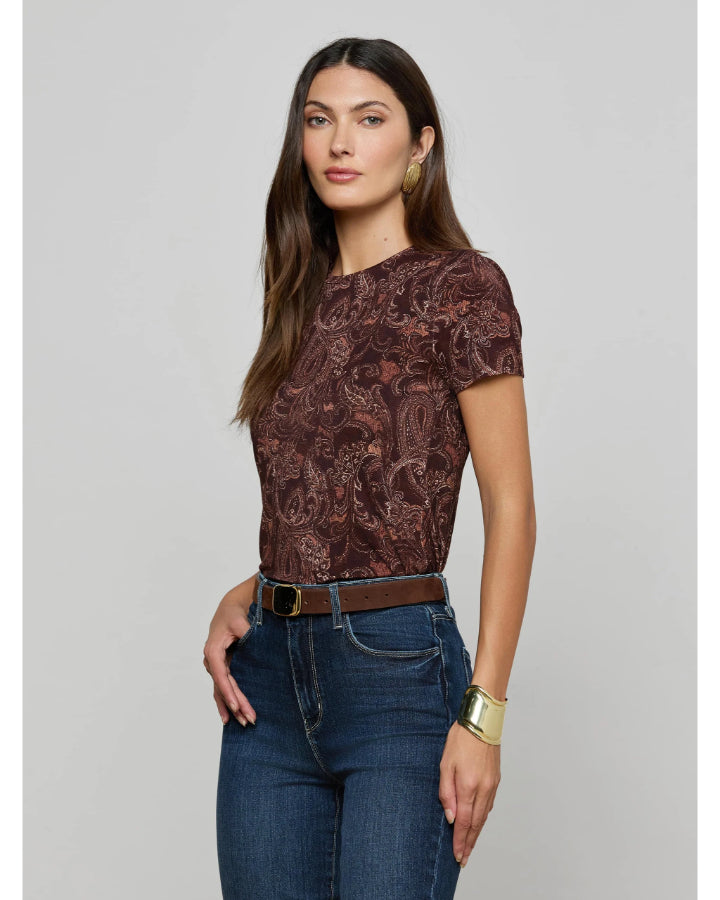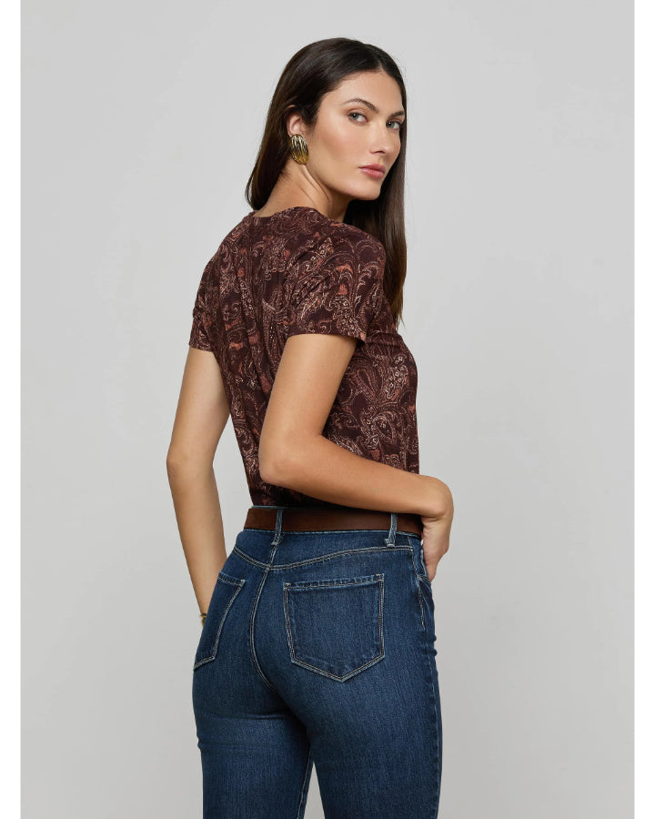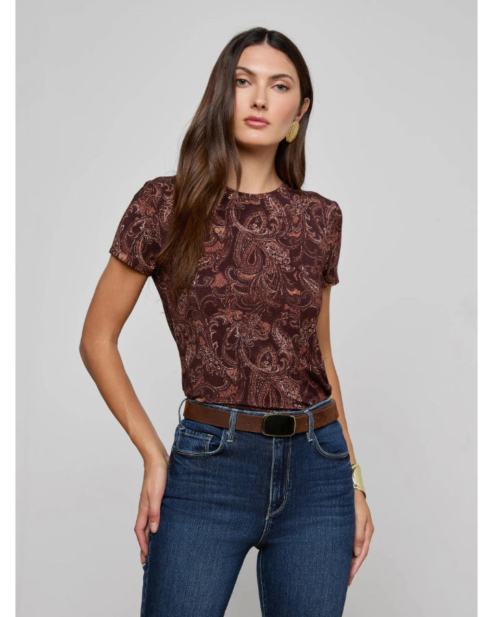 L'Agence quintessential slim fit tee in a brown etched paisley print, supple microfiber stretch fabric with crew neck and short sleeves, Size XS - Length 24.75", Sleeve Length 5.25".